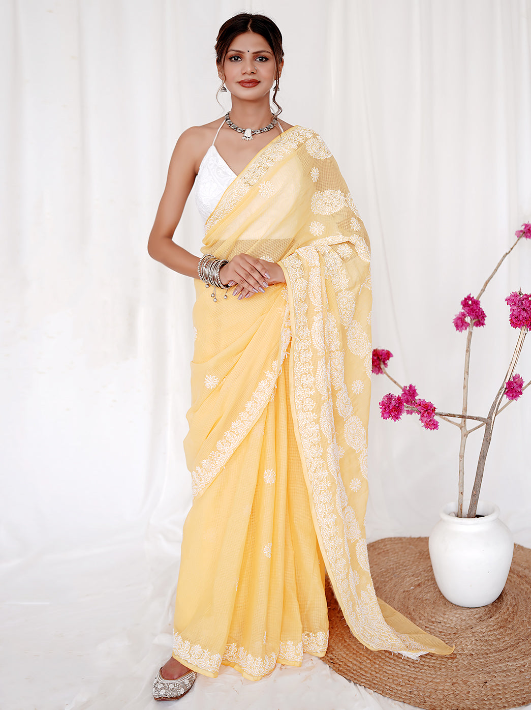 Model wearing yellow modal chikankari straight kurti with white embroidery and white palazzo pants. Bright yellow hand-embroidered Lucknowi kurti featuring white floral chikankari.