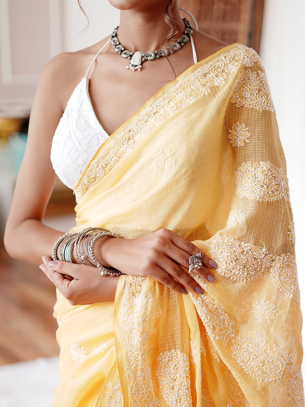 Trending saree style for women featuring sheer Kota Doria material and heritage Lucknowi chikankari craftsmanship.