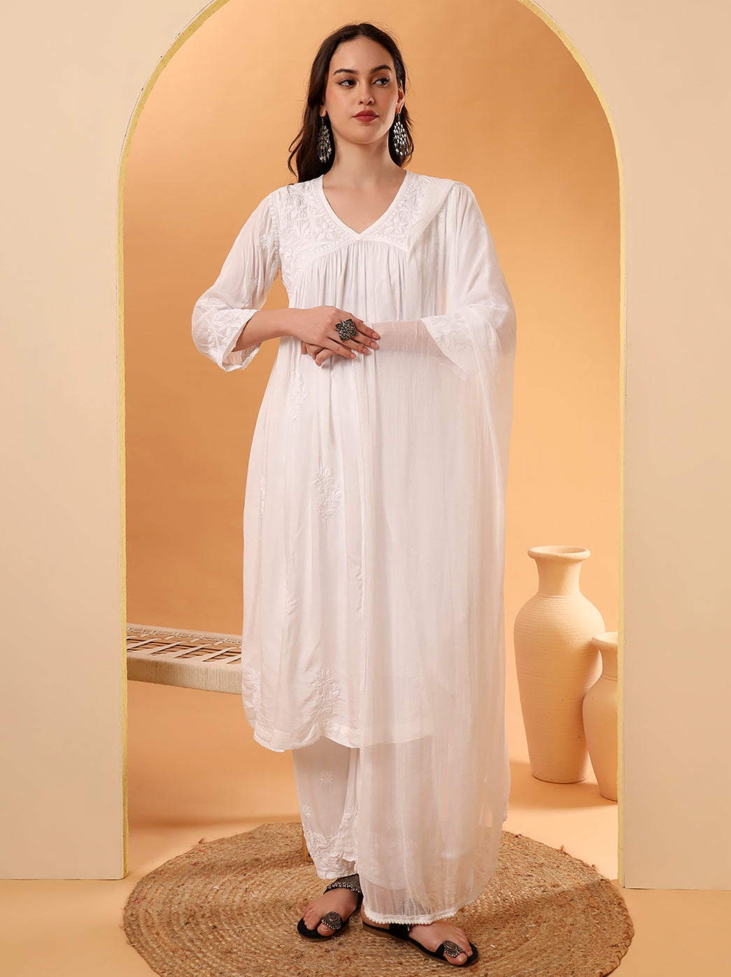 Full-length kurta made from breathable modal fabric featuring intricate hand-embroidered chikankari, styled with ethnic palazzos and heels.