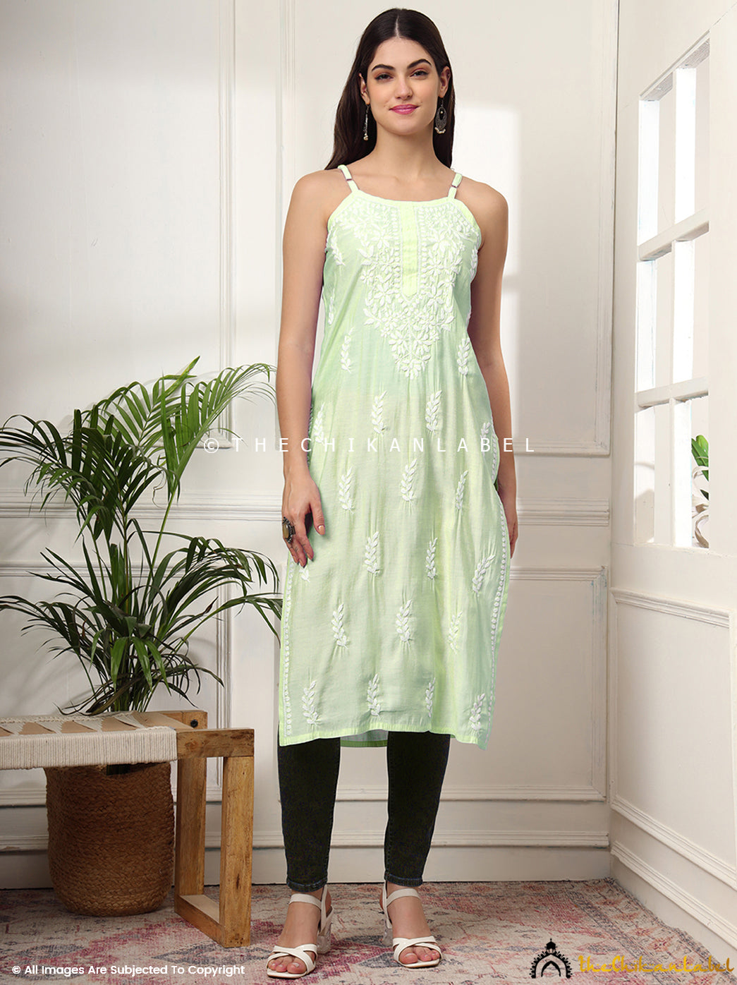 Lightweight modal strappy kurta with chikankari embroidery, a must-have in every ethnic wardrobe for its chic and versatile appeal.