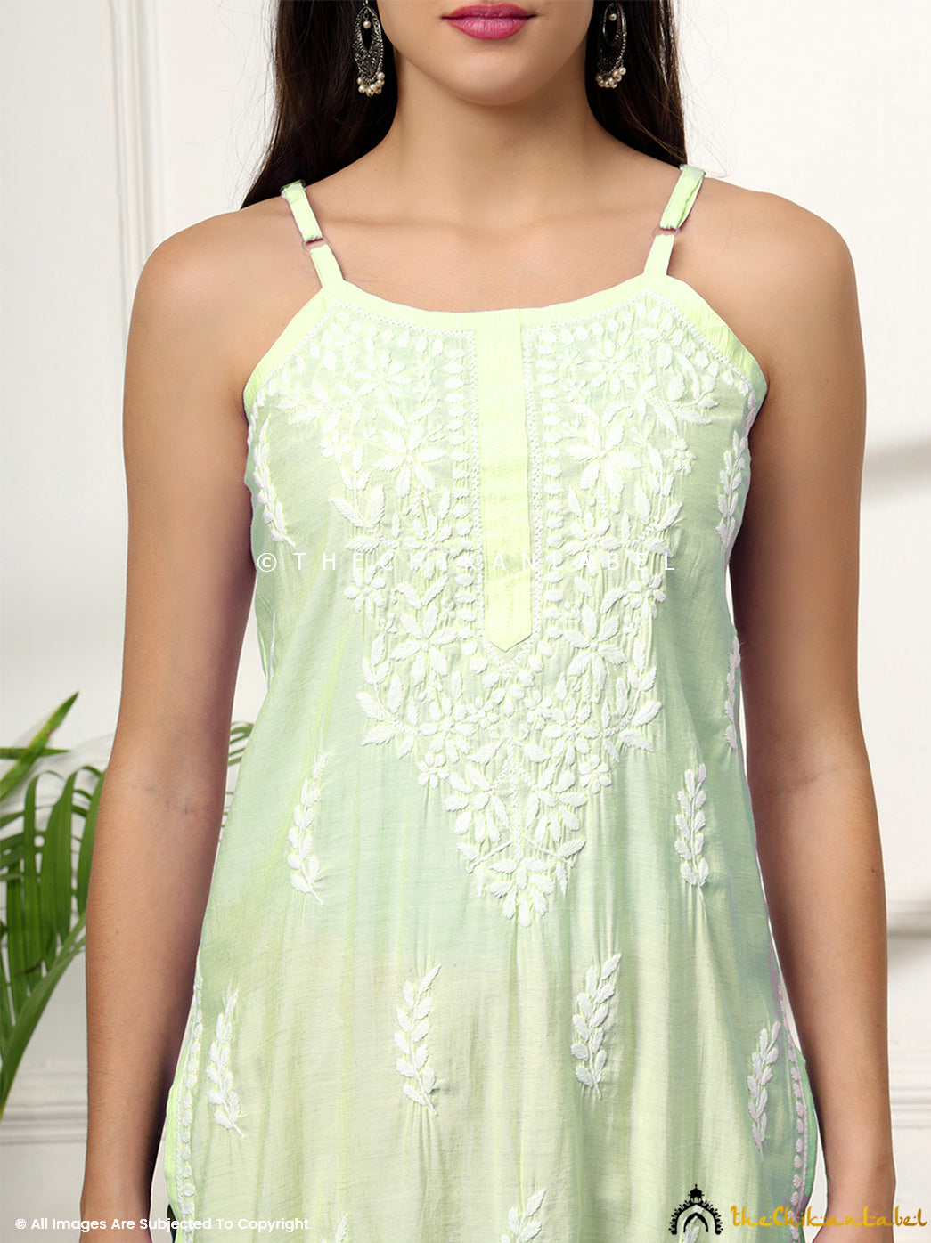 Modal strappy chikankari kurta styled for summer workwear with airy fabric and traditional embroidery.