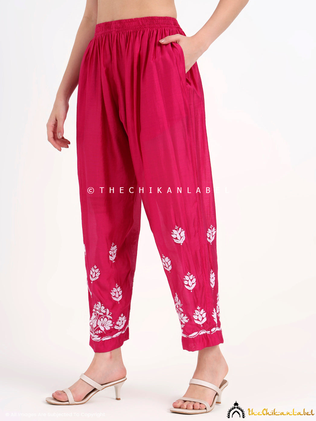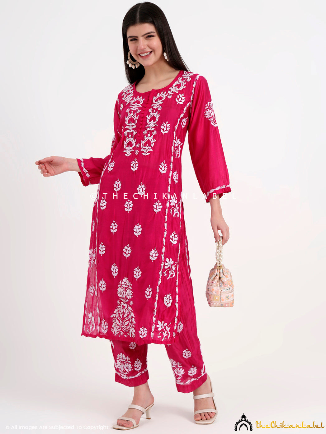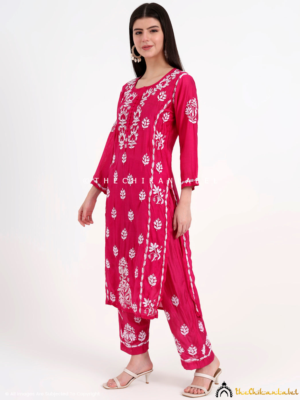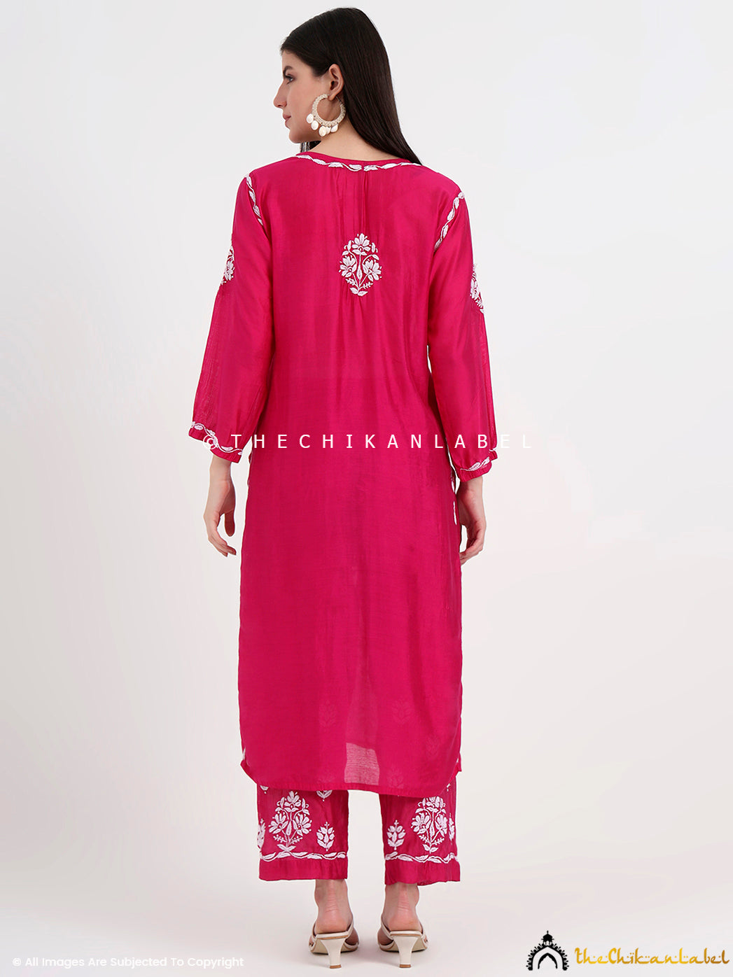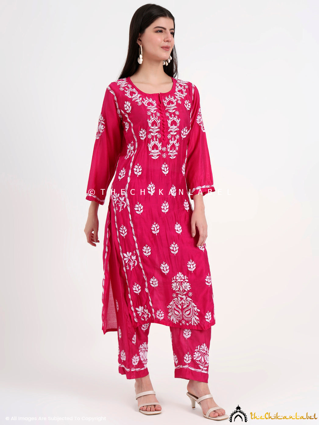 Aasia Chanderi Chikankari Kurti Palazzo Set - Hot Pink