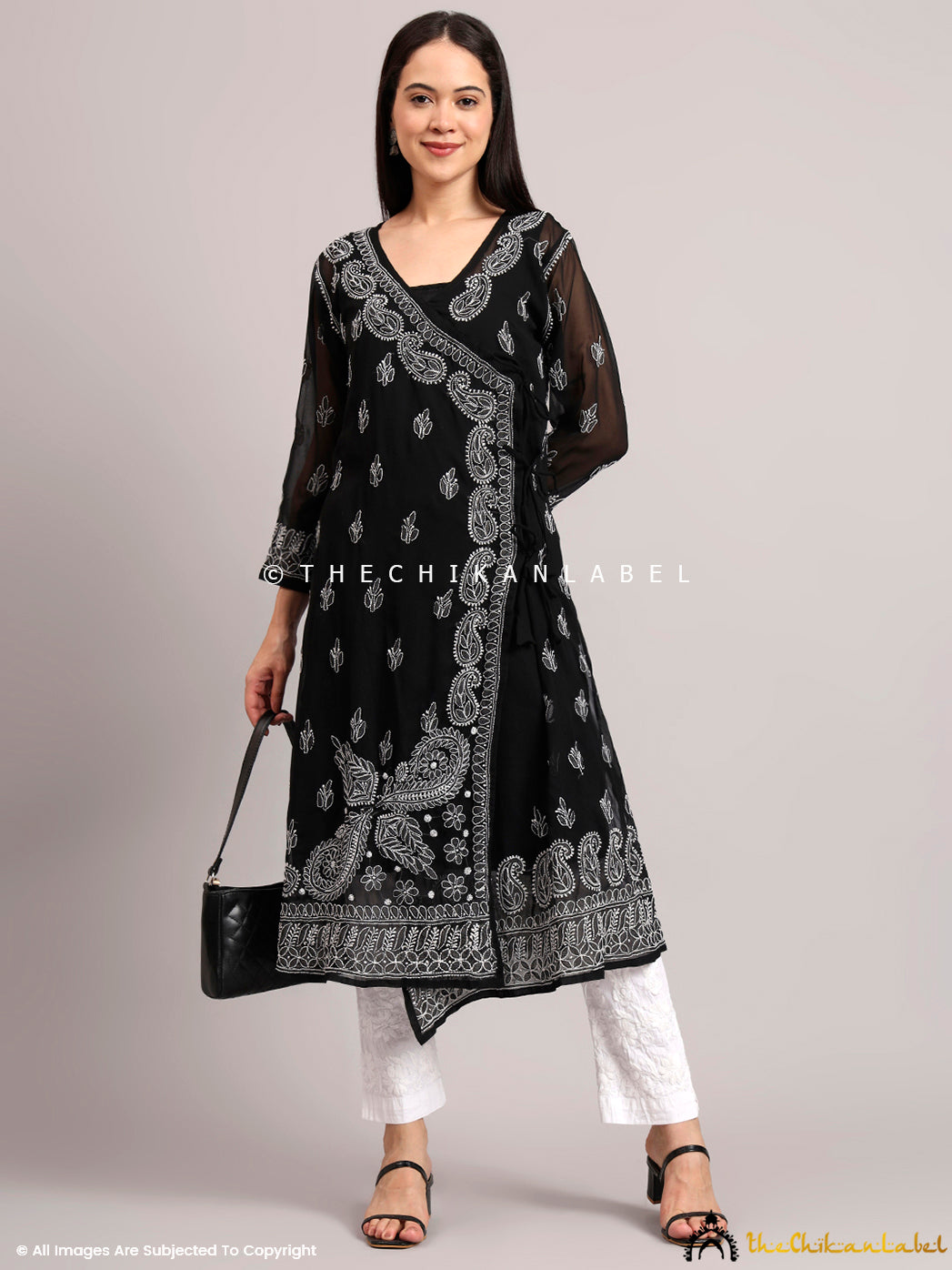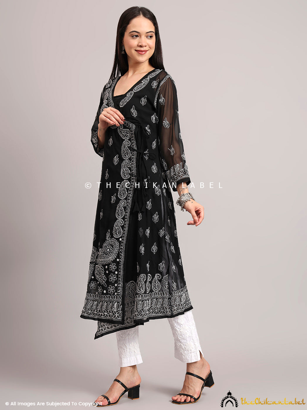 A10: This kurta features an asymmetric Angrakha wrap hem with a side-tie design, offering a graceful drape and stylish movement.