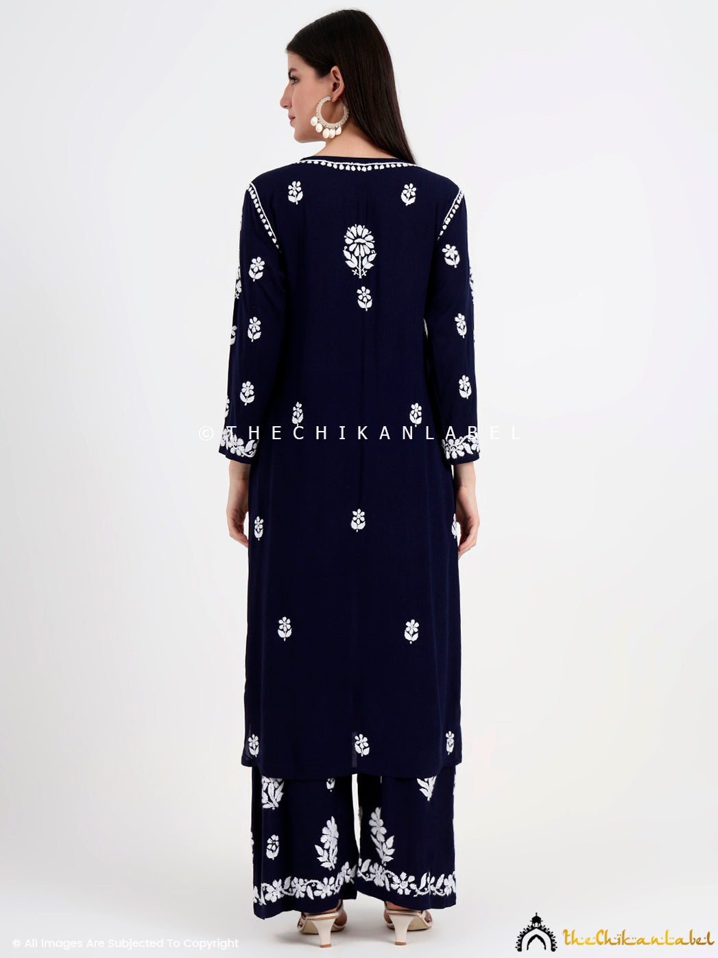 Designer chikankari modal kurti and palazzo set worn by model, perfect for those seeking a chic and modern ethnic wardrobe.