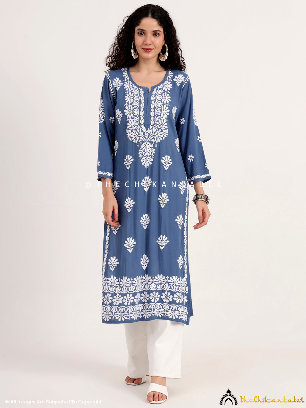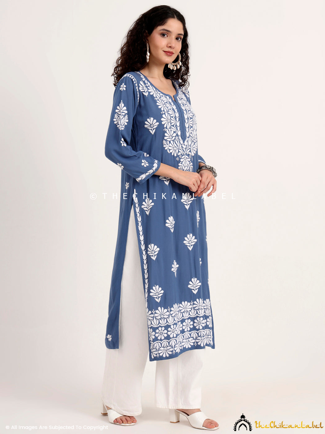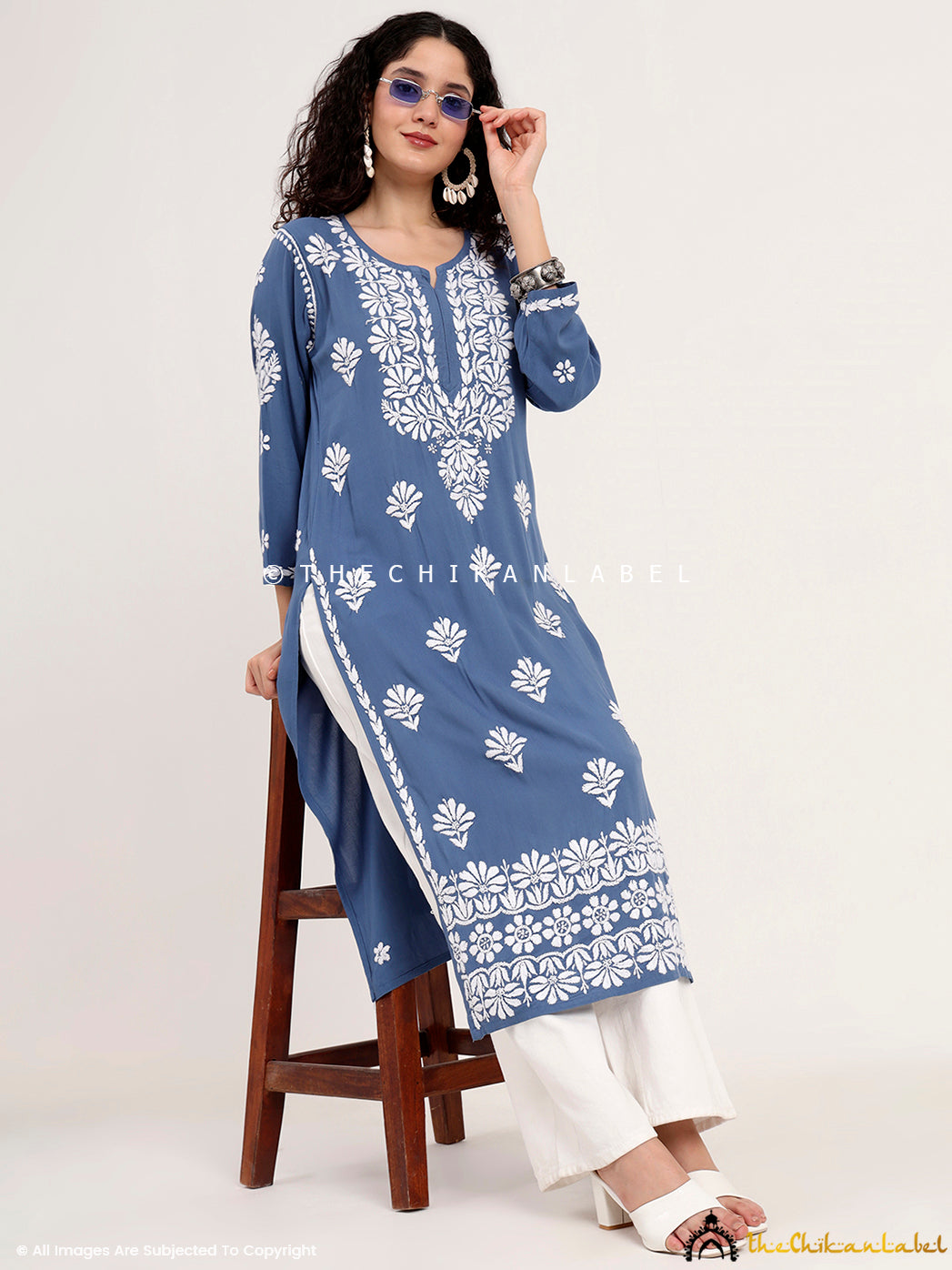 Hand-embroidered chikankari kurti in soft rayon fabric, ideal for creating ethnic looks that are both contemporary and timeless.
