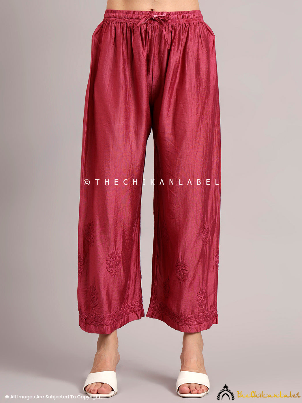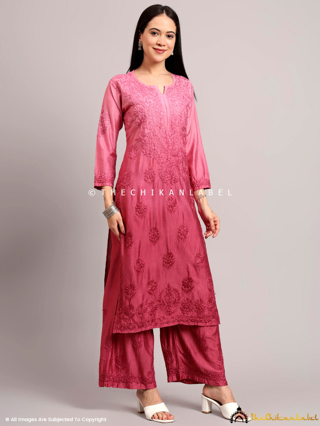 A1. A Chikankari Chanderi kurti palazzo set is a two-piece ethnic outfit made from lightweight chanderi fabric, hand-embroidered with traditional Lucknowi chikankari designs. It includes a straight kurti and matching palazzo pants.
