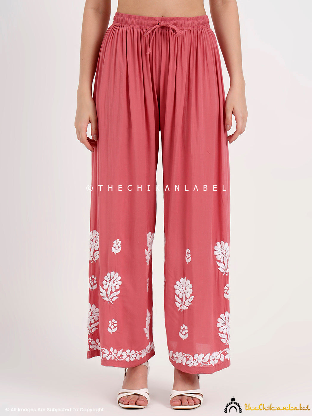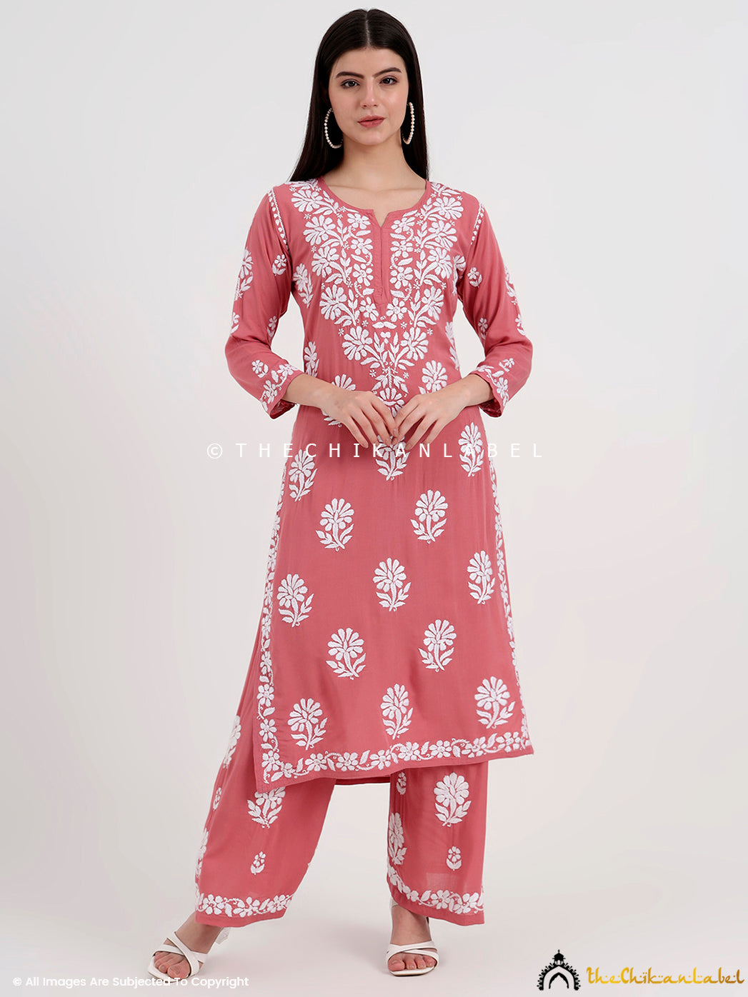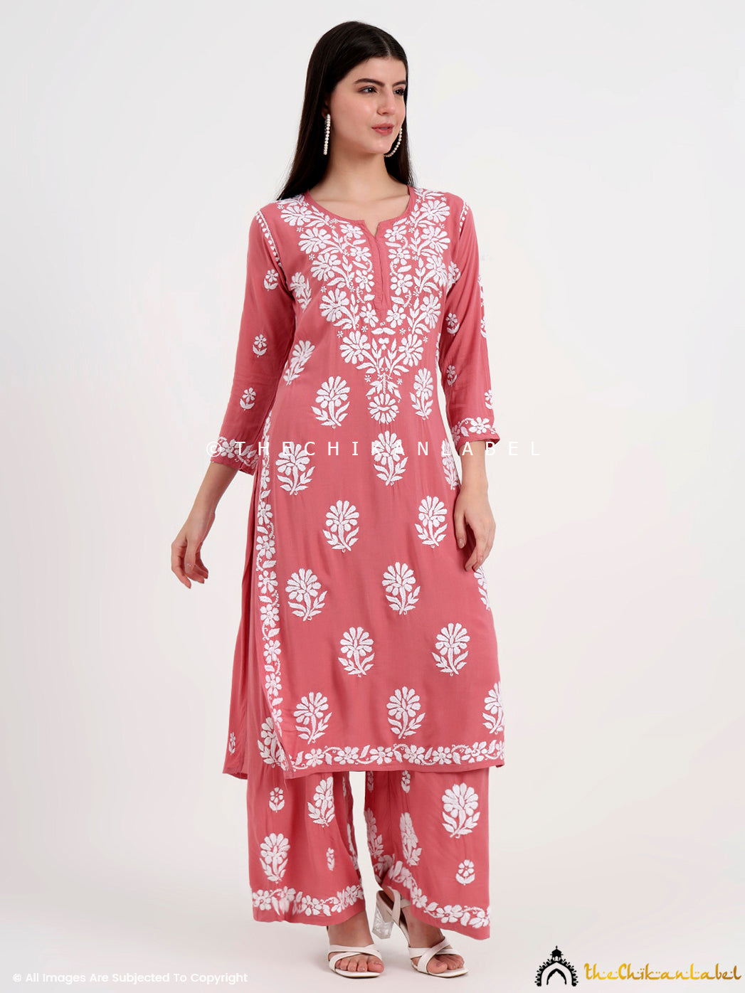 Modal chikankari set with straight kurti and elastic waist palazzo, perfect for office wear or casual ethnic dressing.