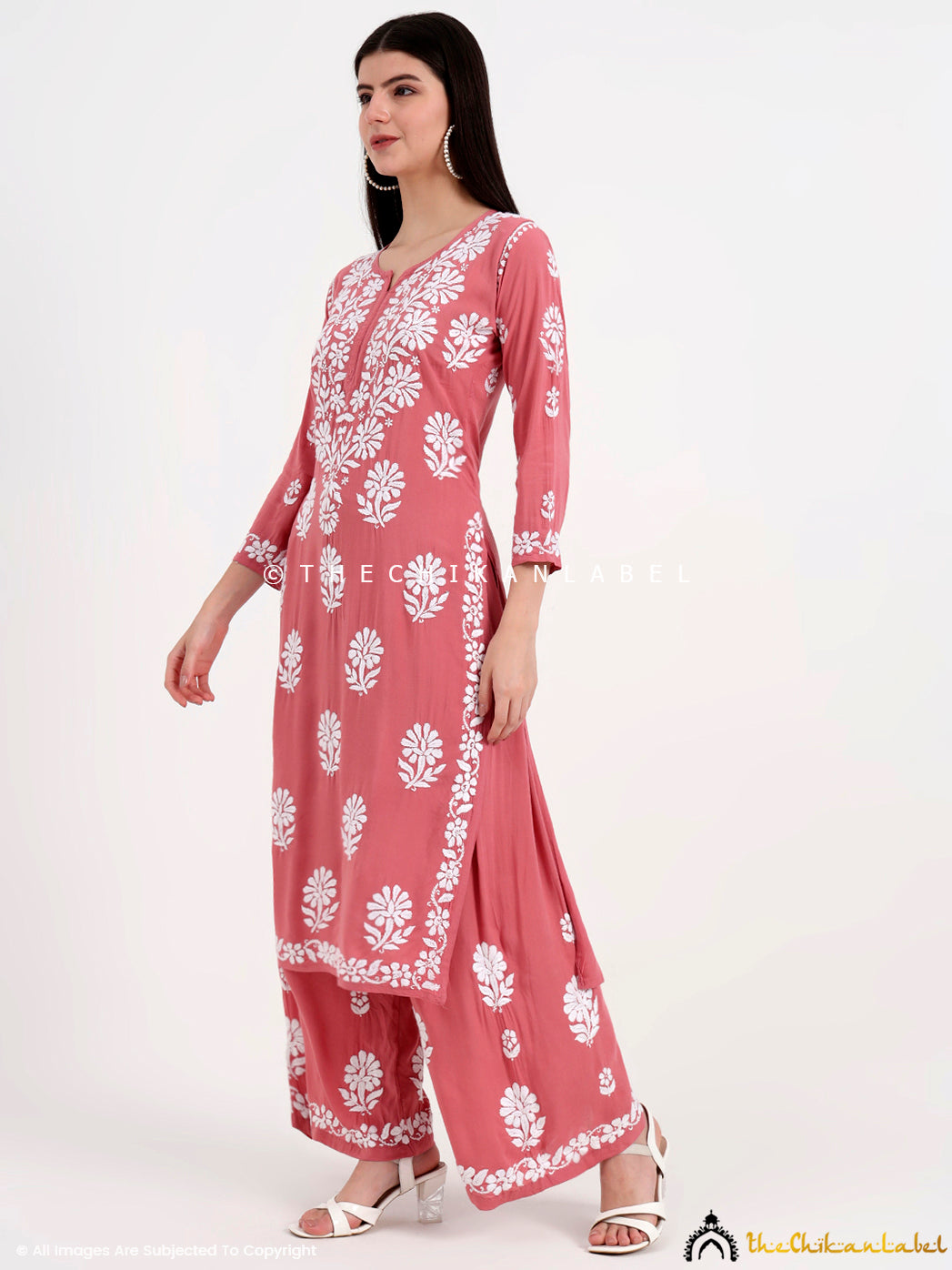 Side profile of model in trending chikankari modal kurti palazzo set, highlighting threadwork and fluid drape of modal fabric.