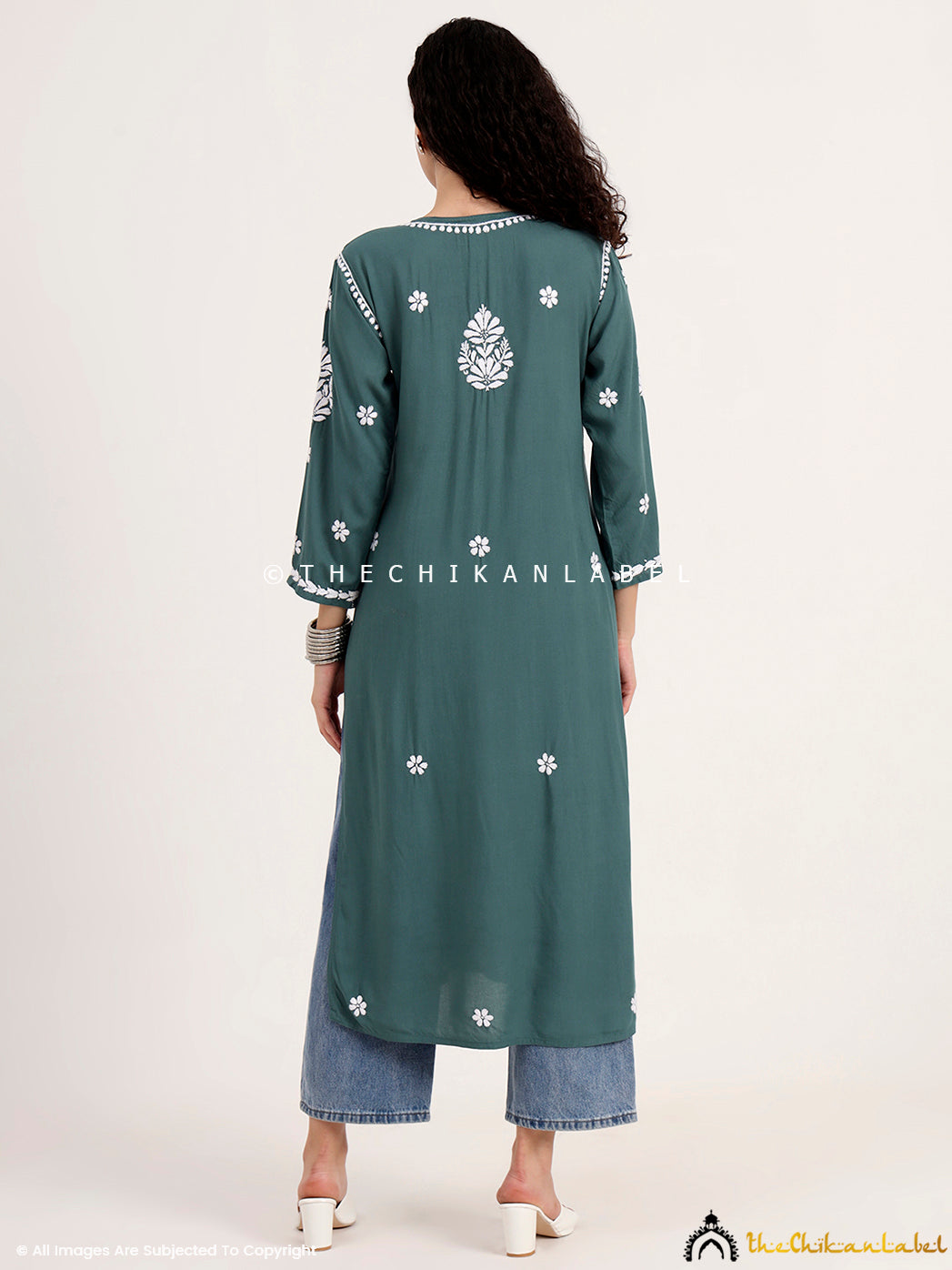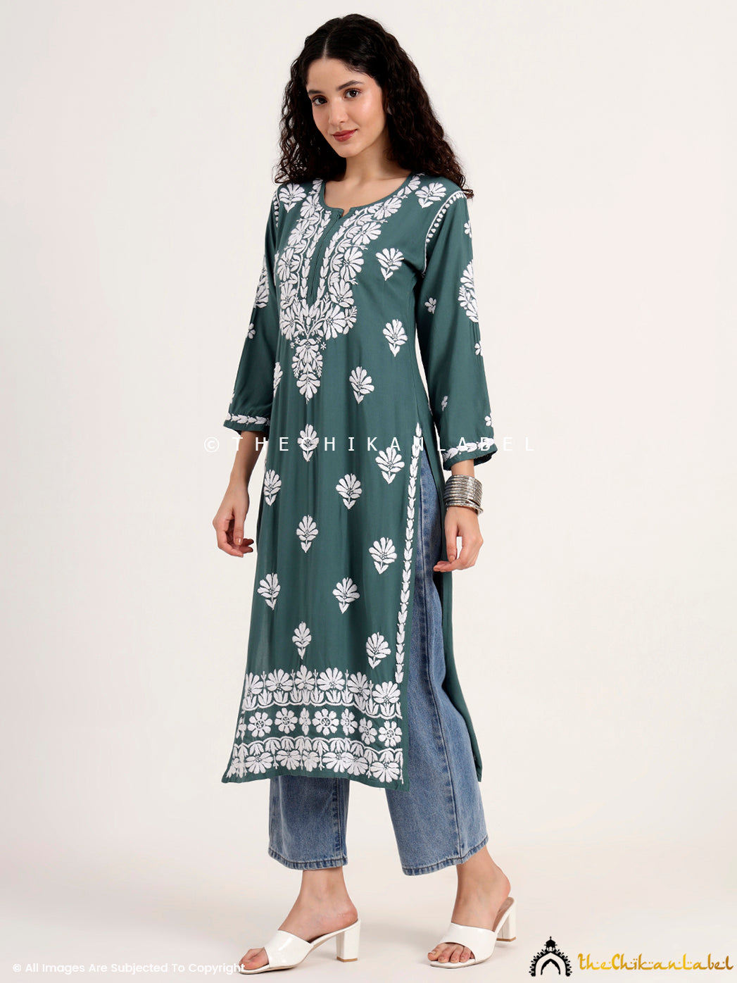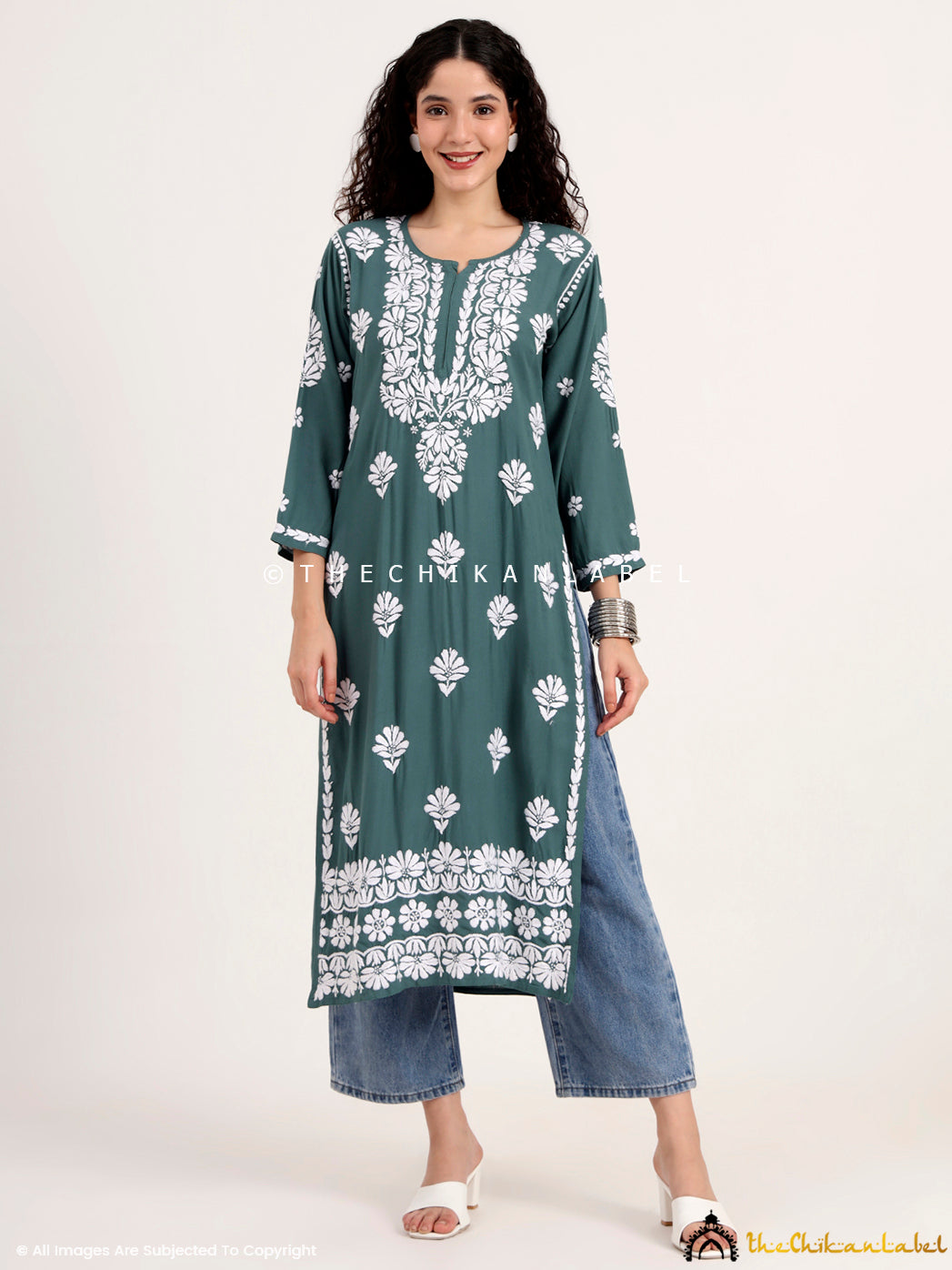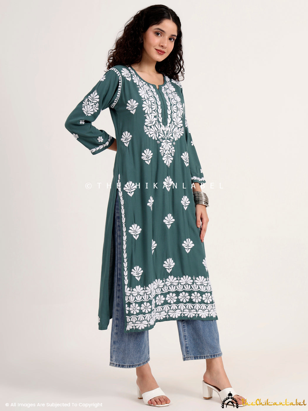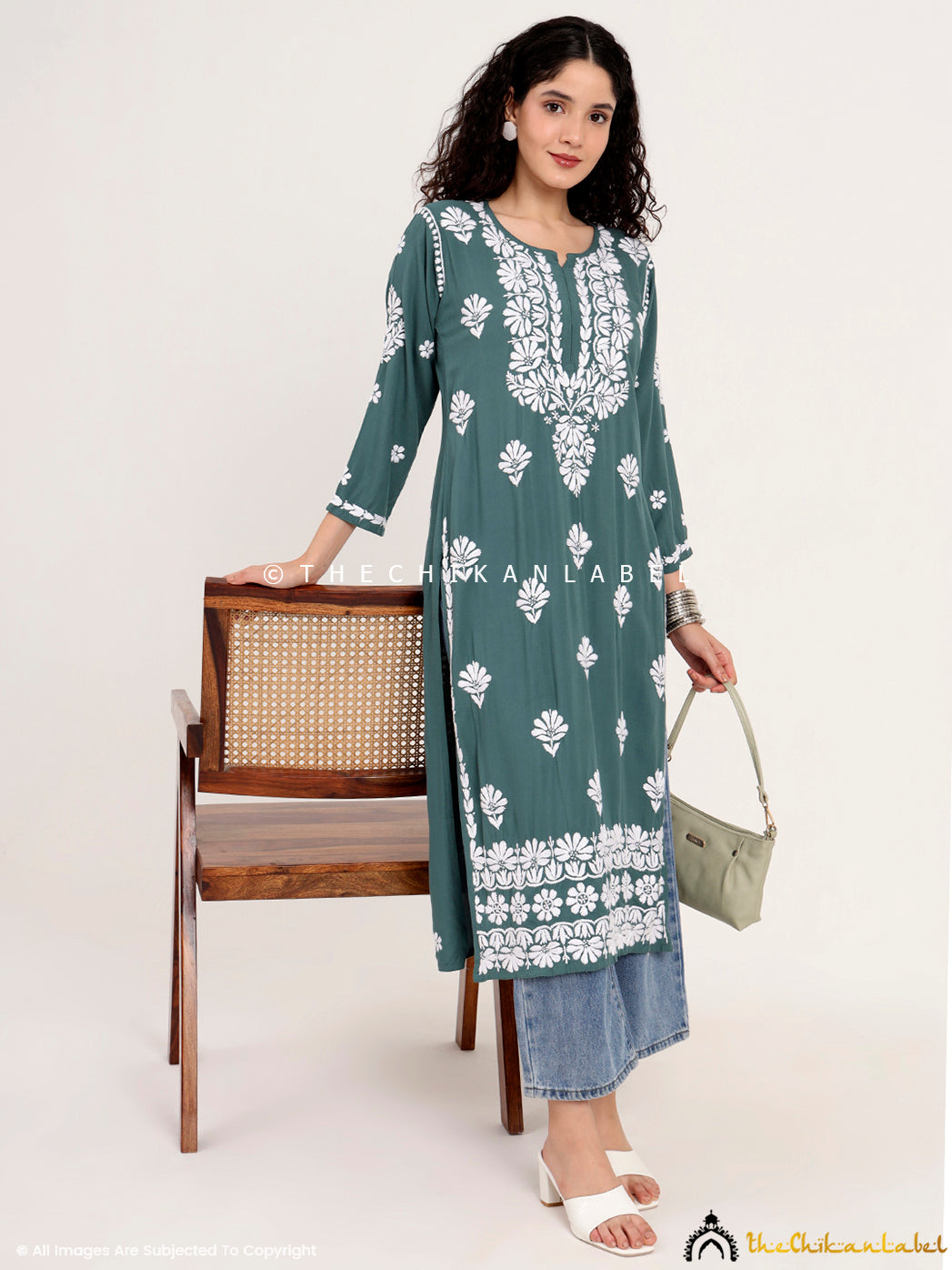 Rayon chikankari kurti showcasing traditional floral motifs in a clean, straight fit—ideal for festive mornings, office routines, or casual weekends.