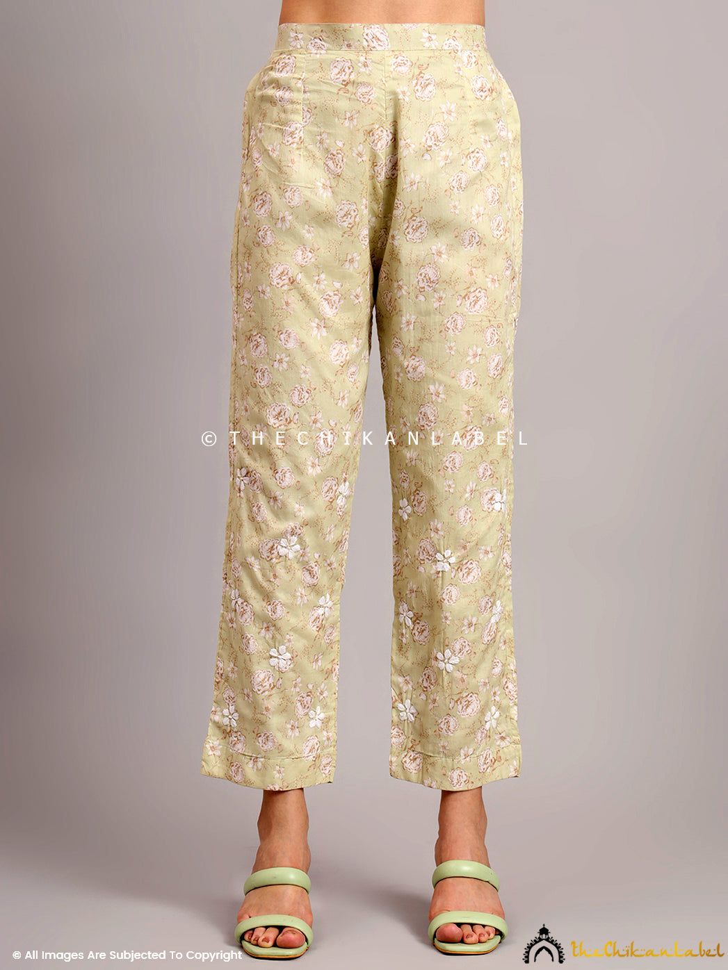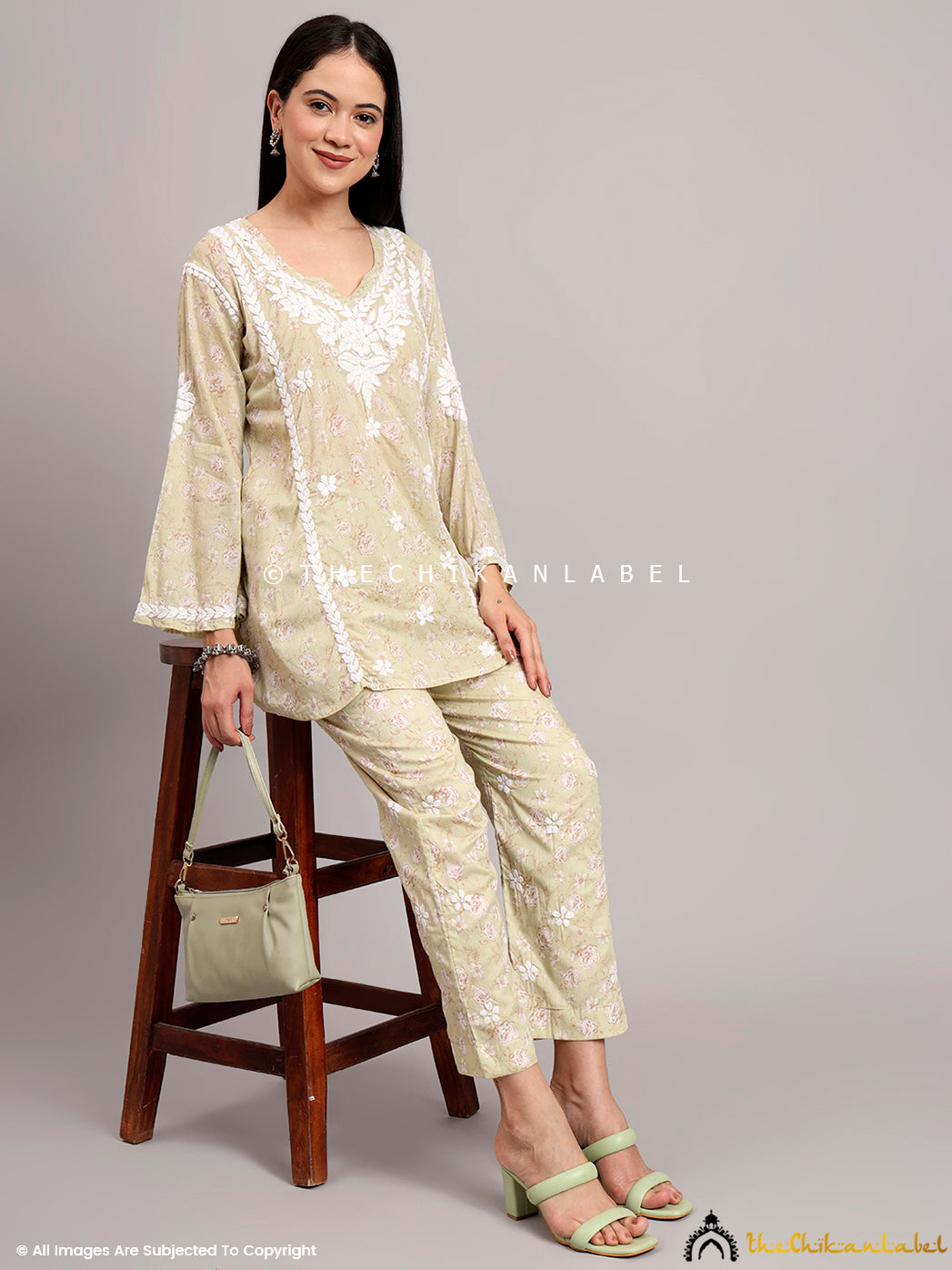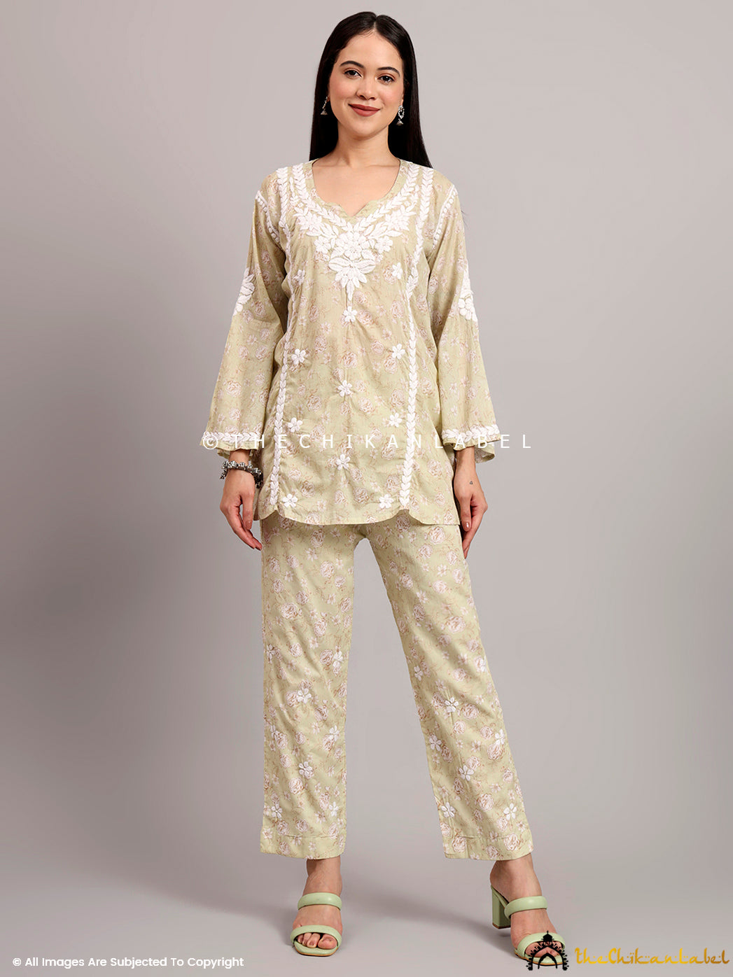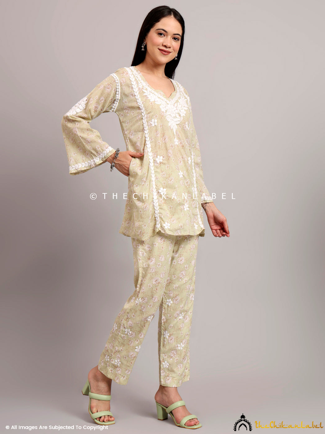 Elegant casual wear coord set styled with straight pants and a printed Chikankari kurta, perfect for summer brunches and workdays