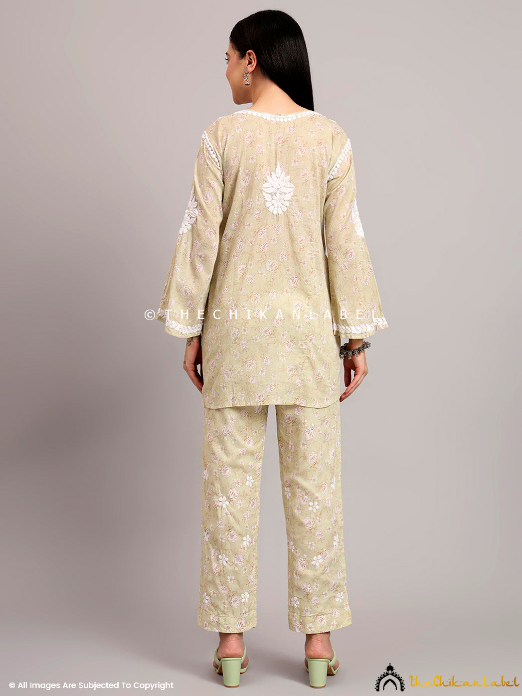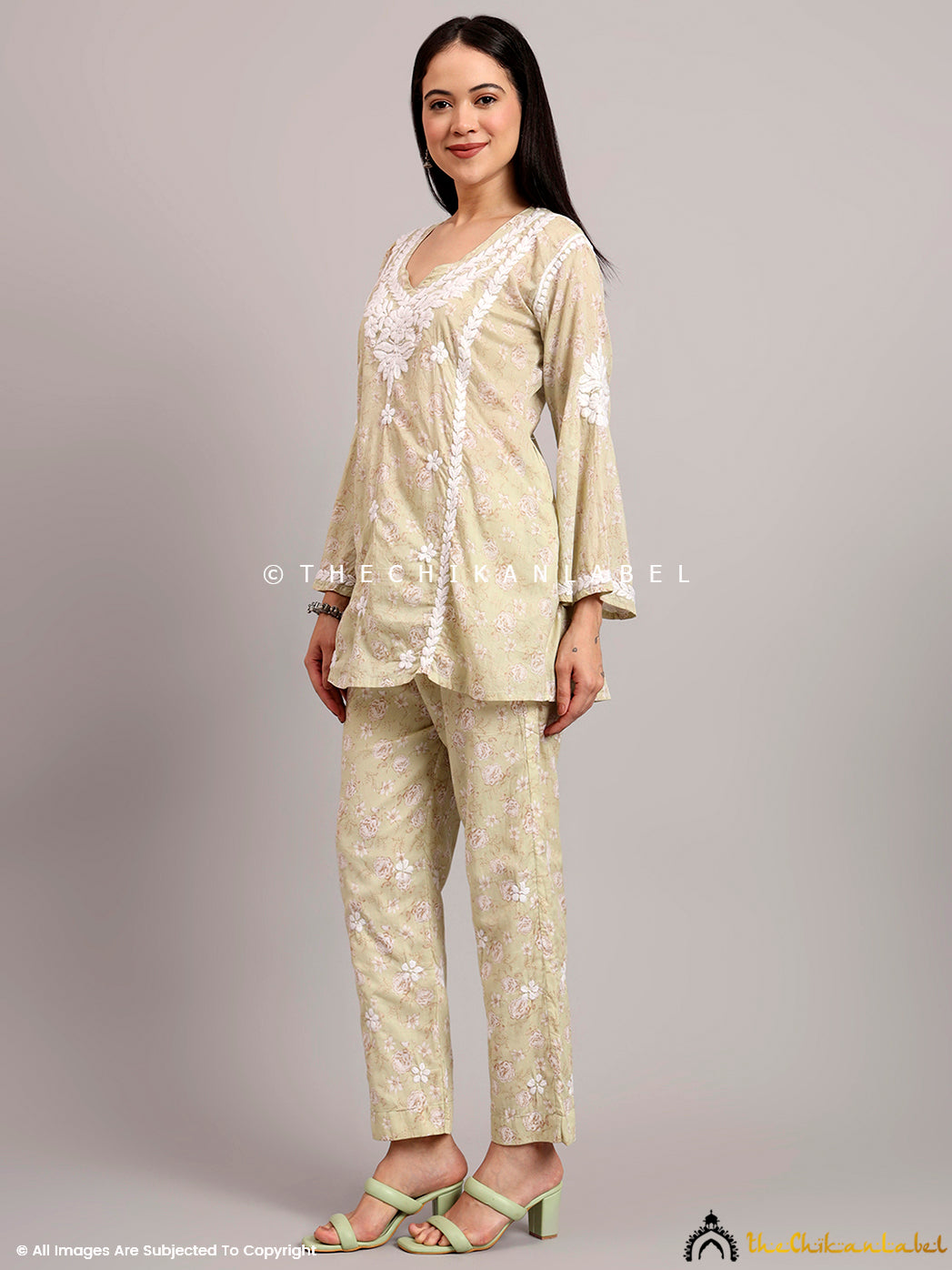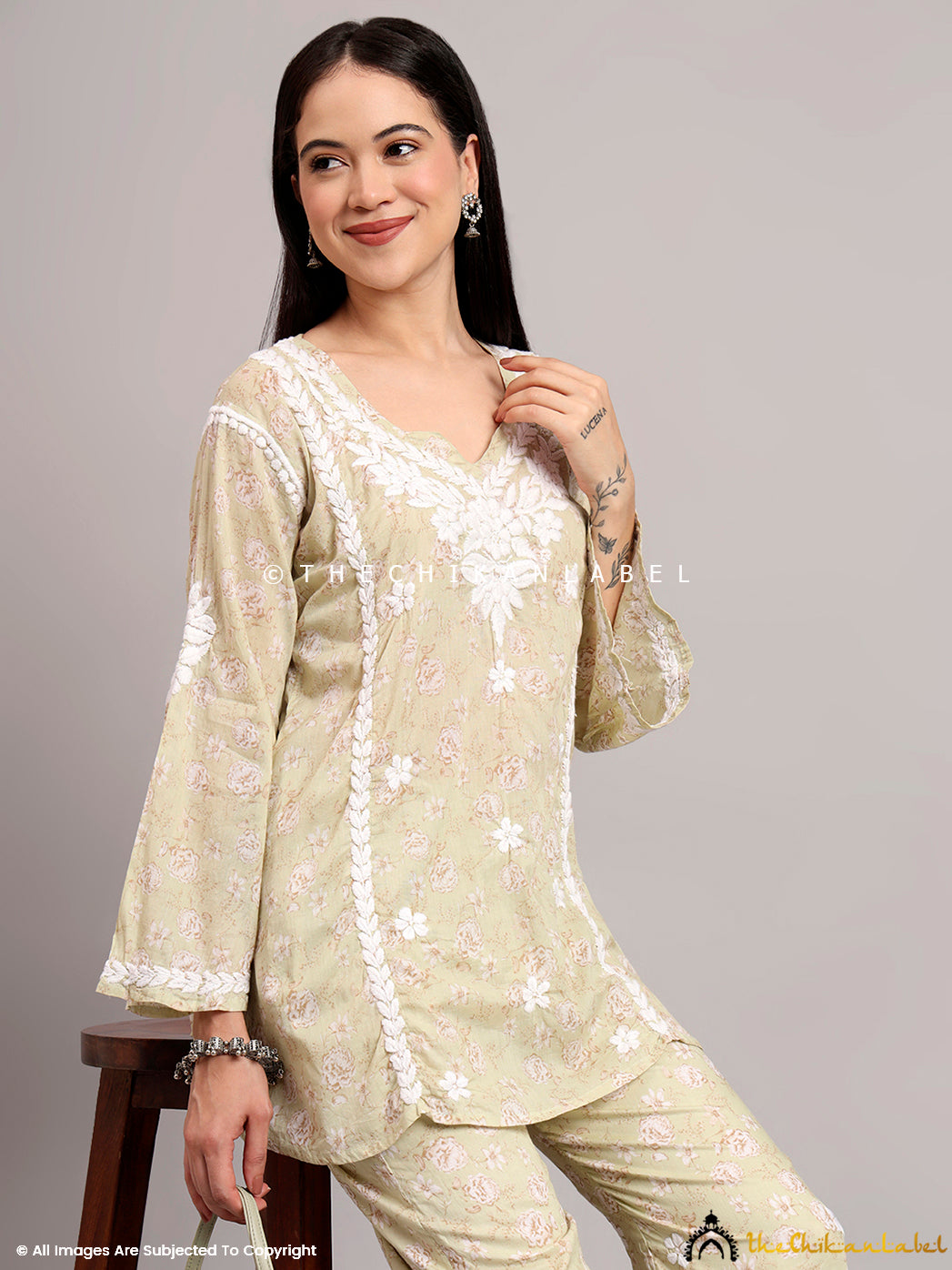 Full-length view of a printed co-ord set with artisanal Chikankari on the kurta front, styled with minimal accessories for a casual ethnic look