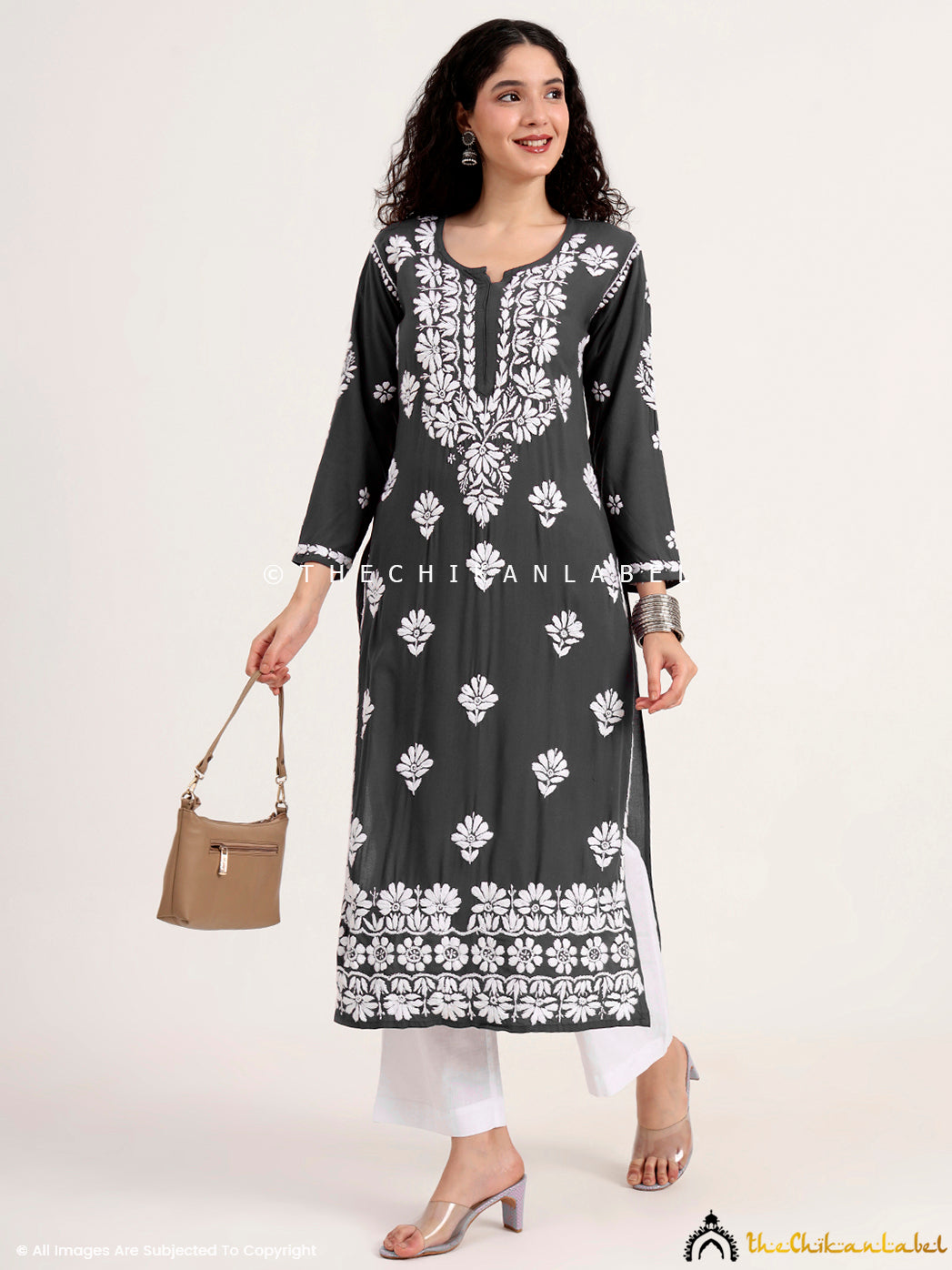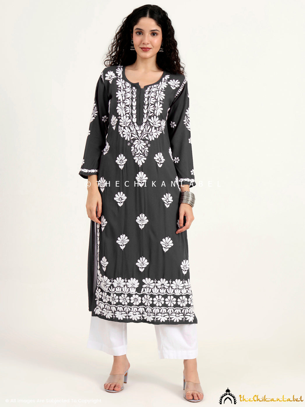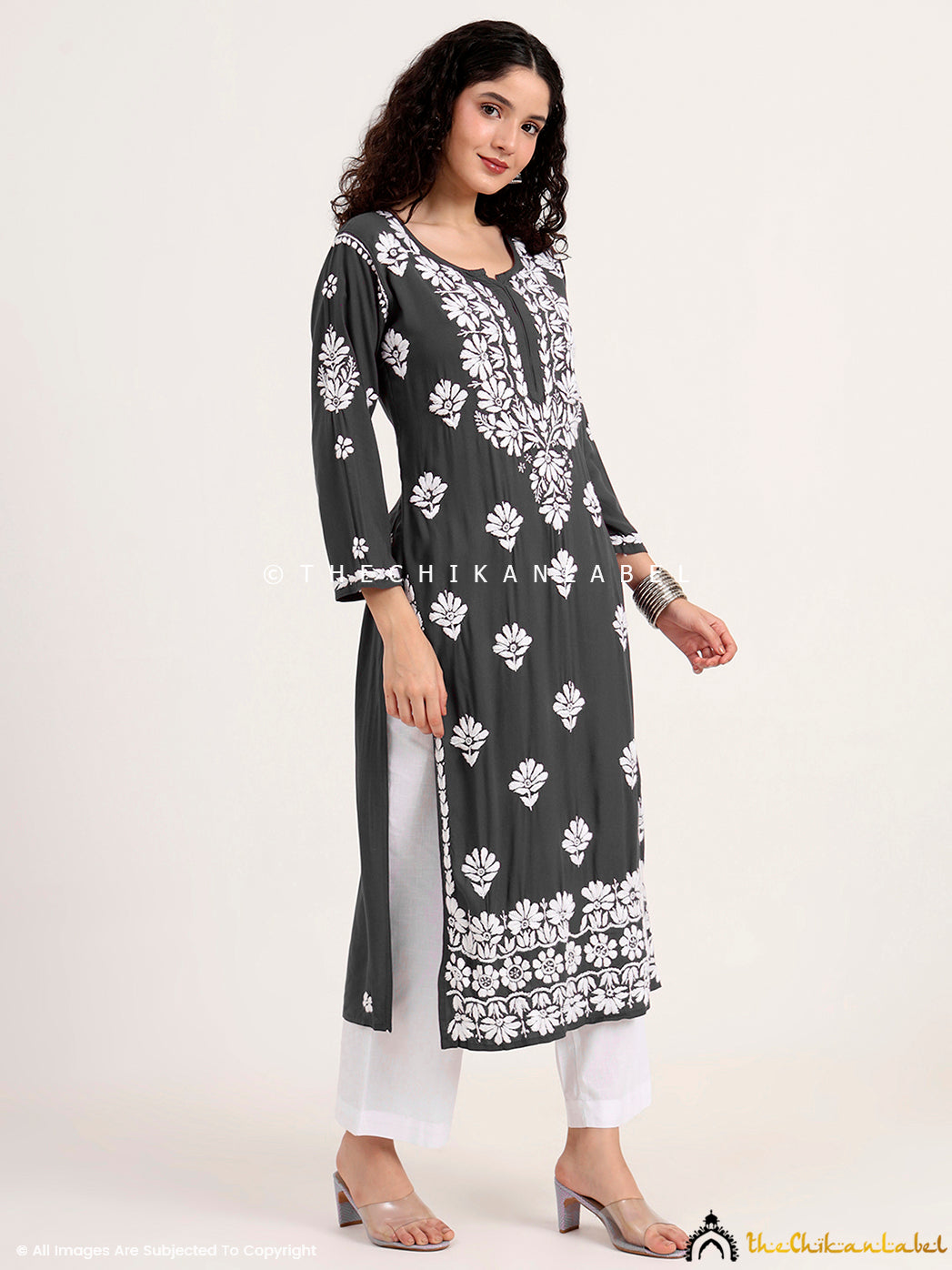 Handcrafted trending chikankari kurti with intricate threadwork and lightweight rayon fabric, designed for graceful ethnic dressing in any season.