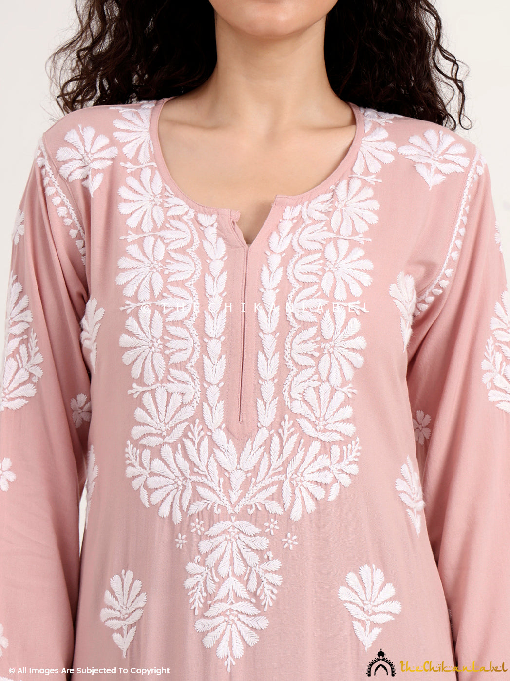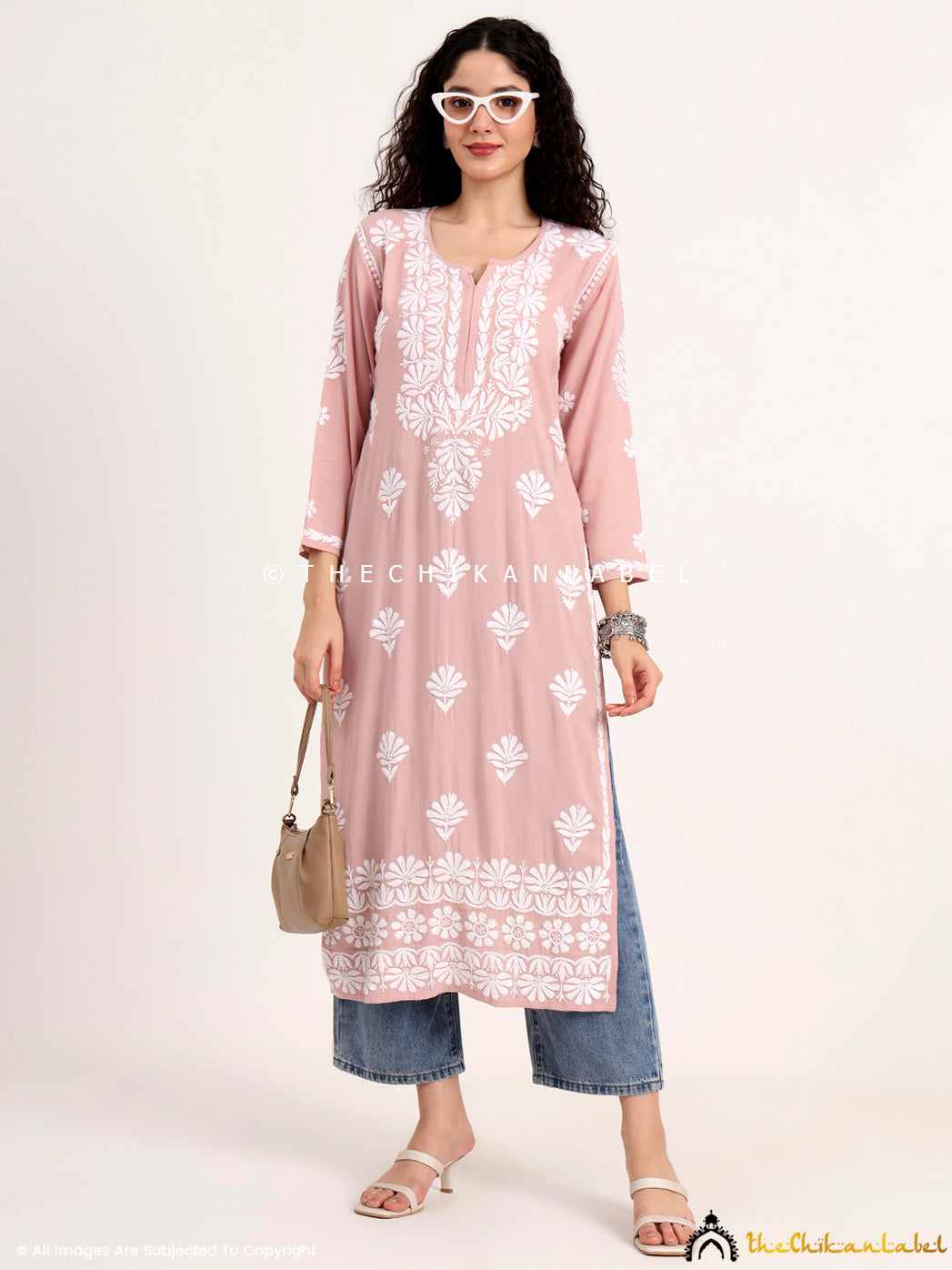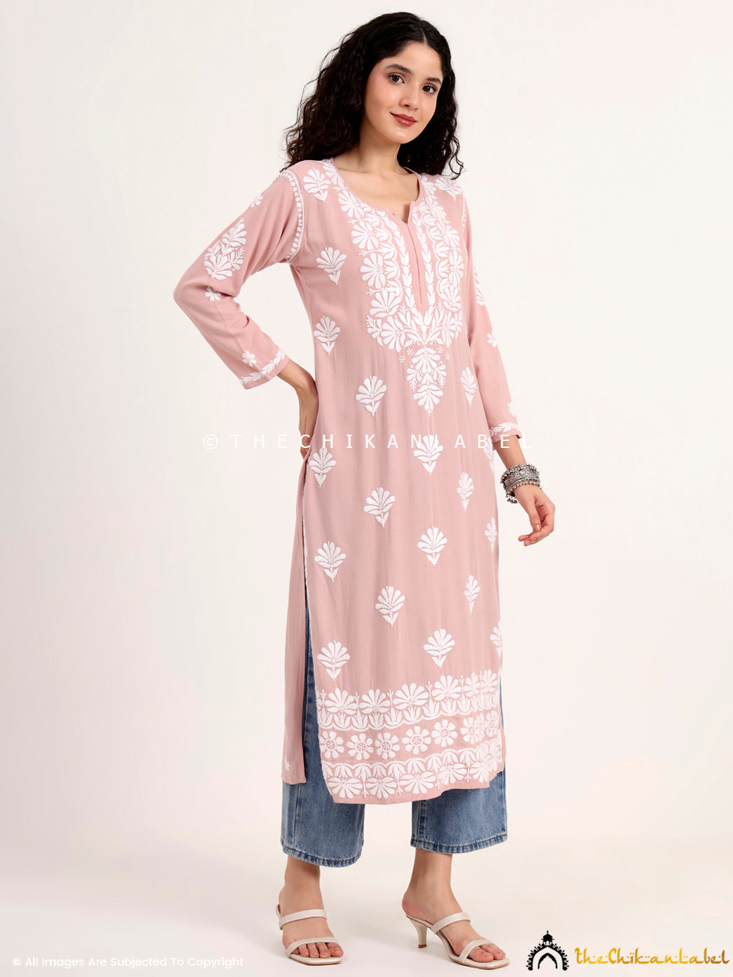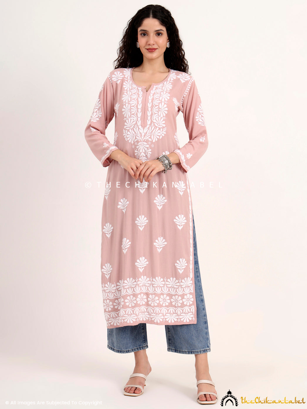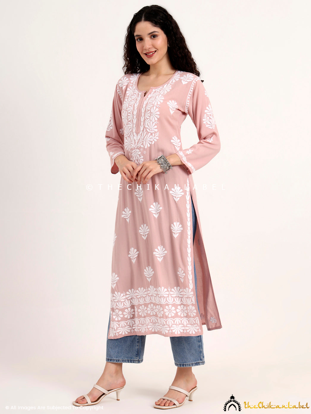 Model gracefully showcasing a trending chikankari kurti designed in breathable rayon fabric, hand-embroidered with floral patterns, offering the perfect balance of traditional design and modern comfort.