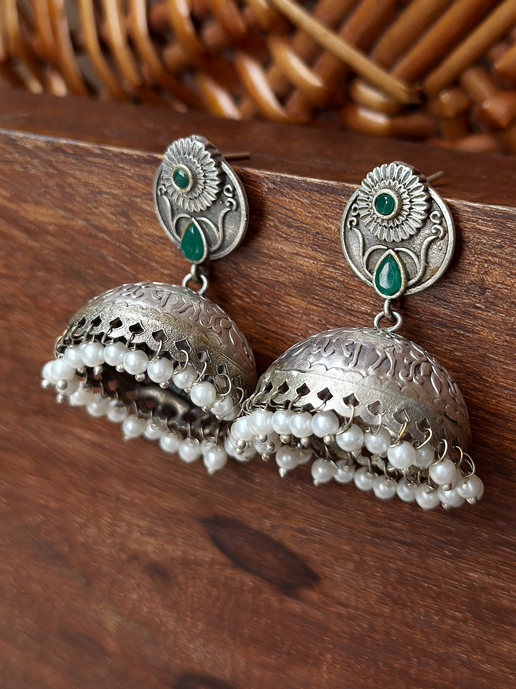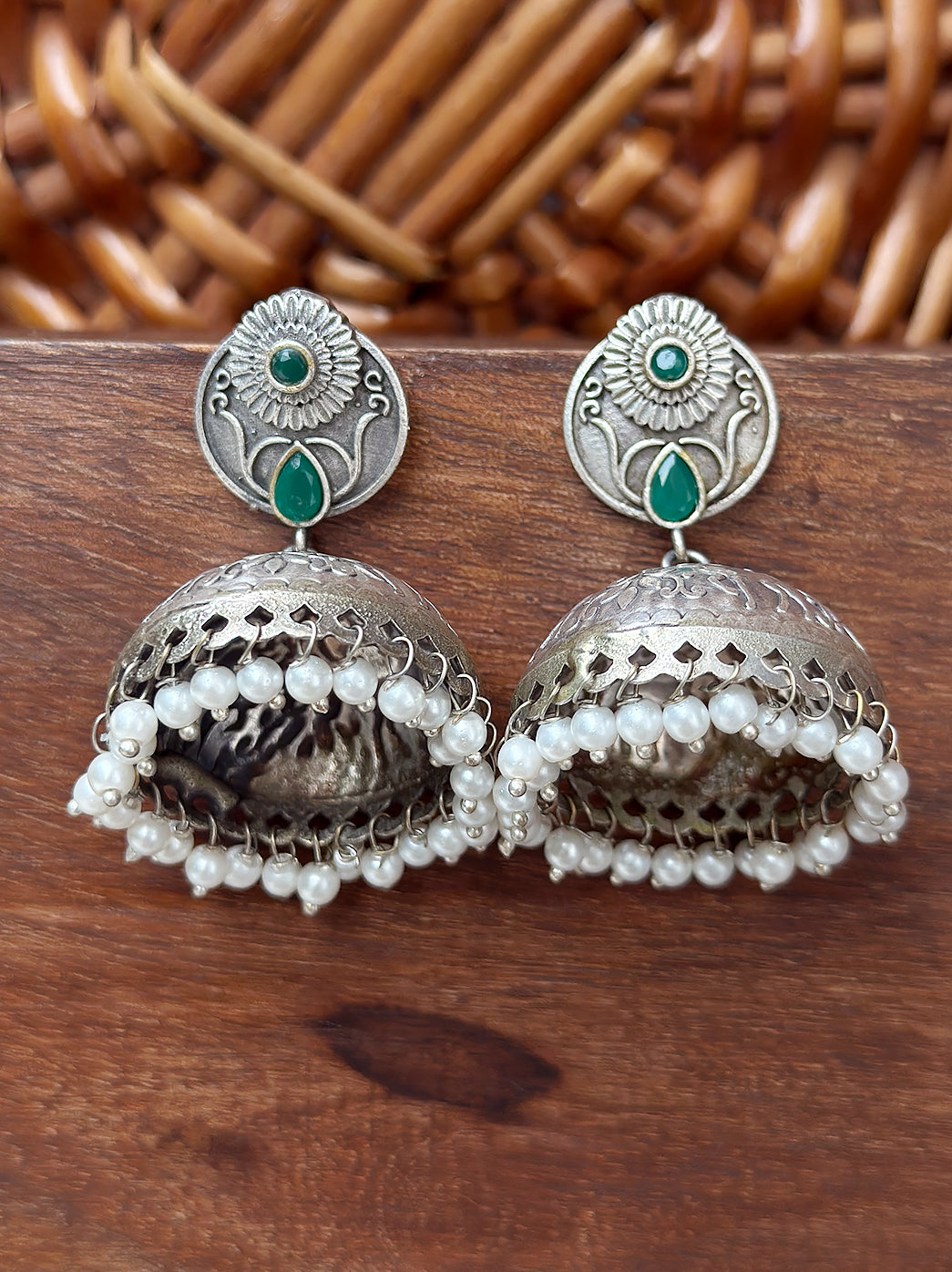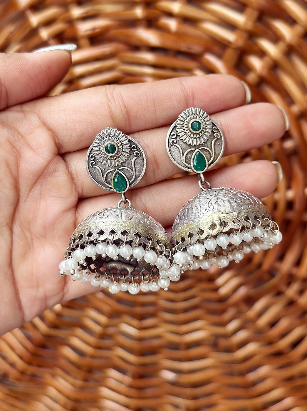 Oxidized Handcrafted Green Kundan Jhumka Earring with Pearl