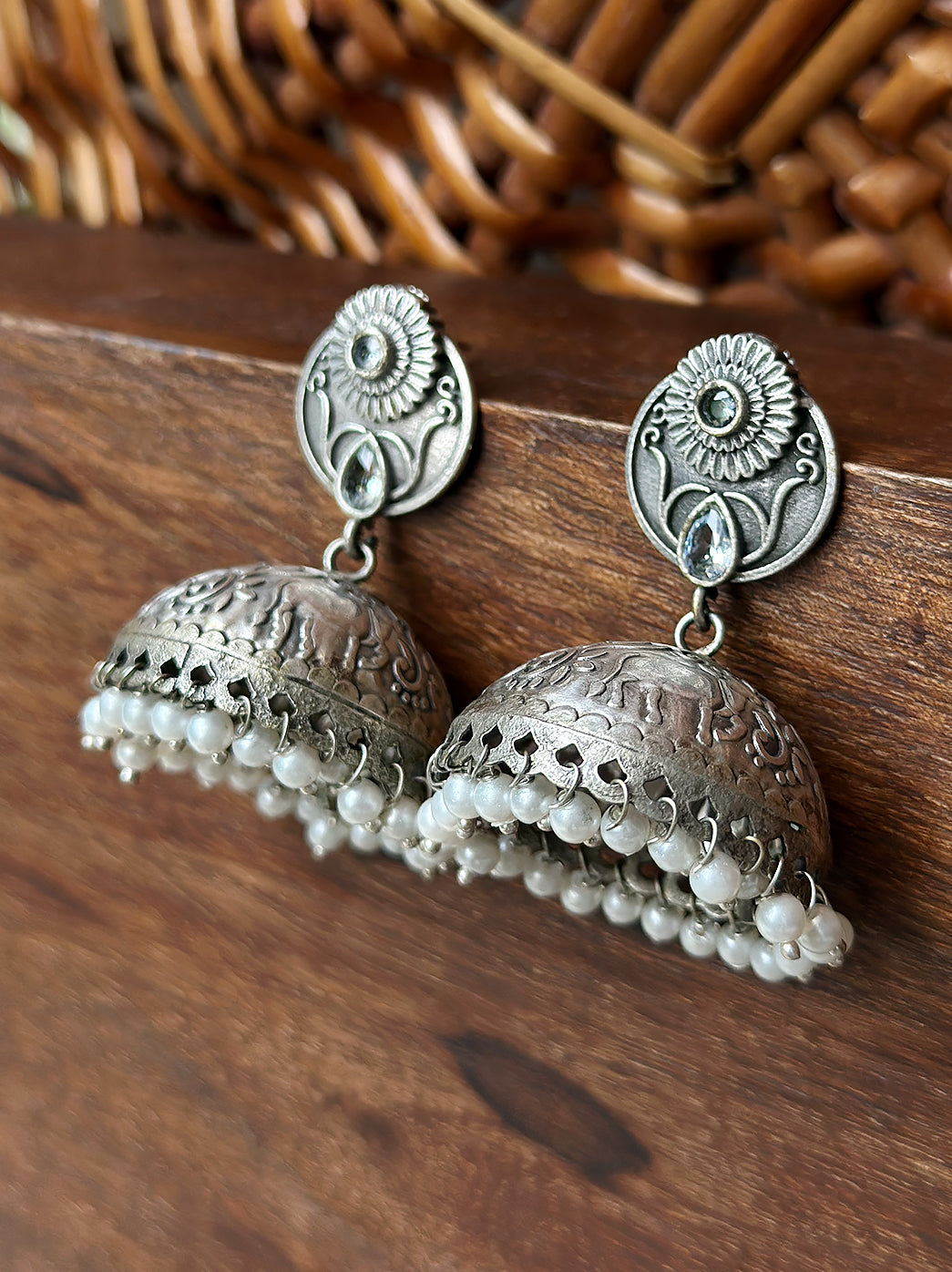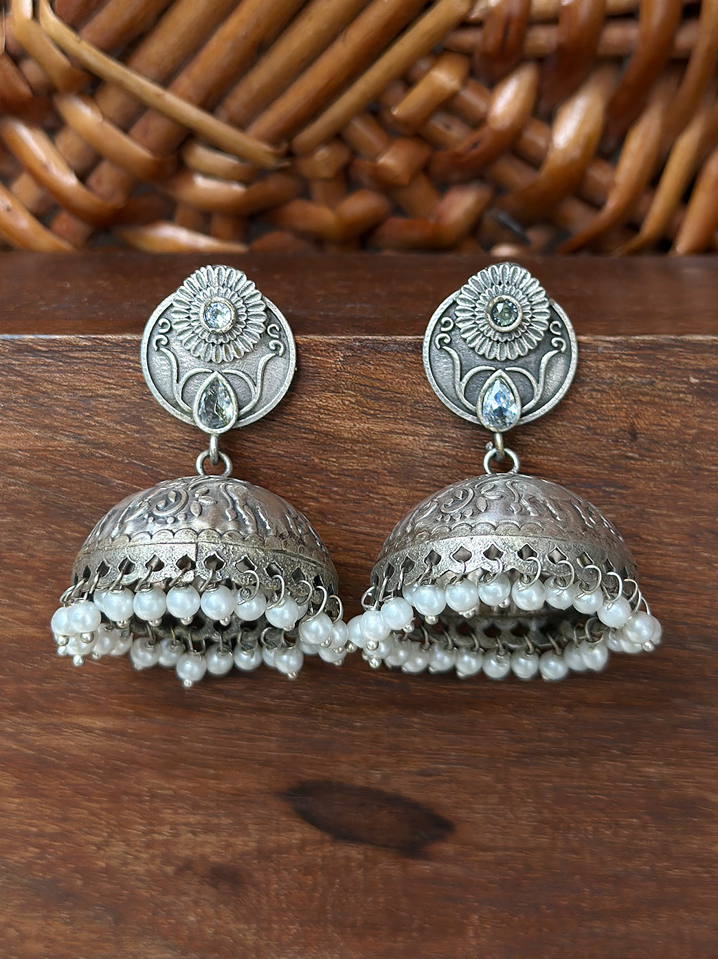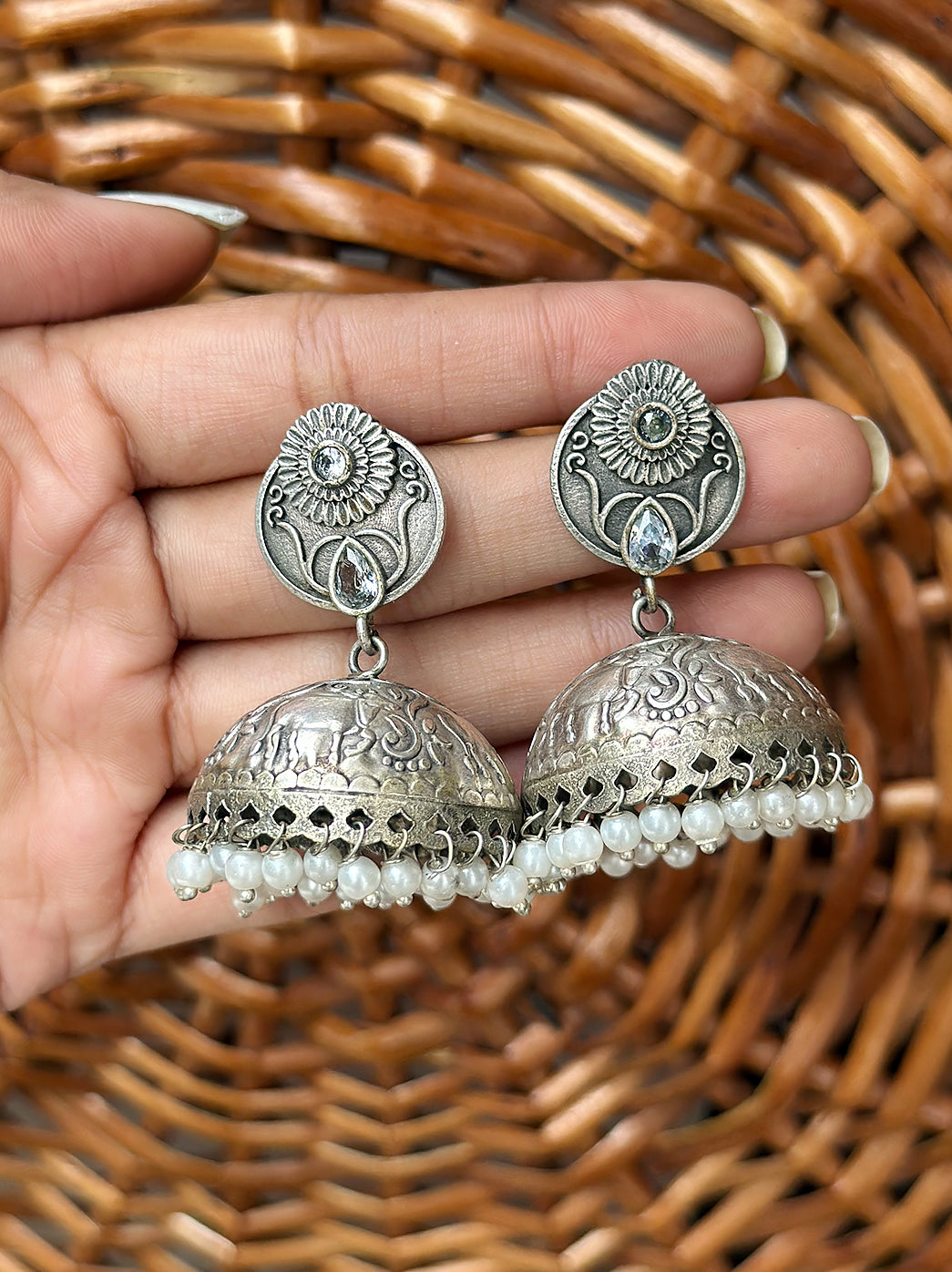 Oxidized Handcrafted White Kundan Jhumka Earring with Pearl