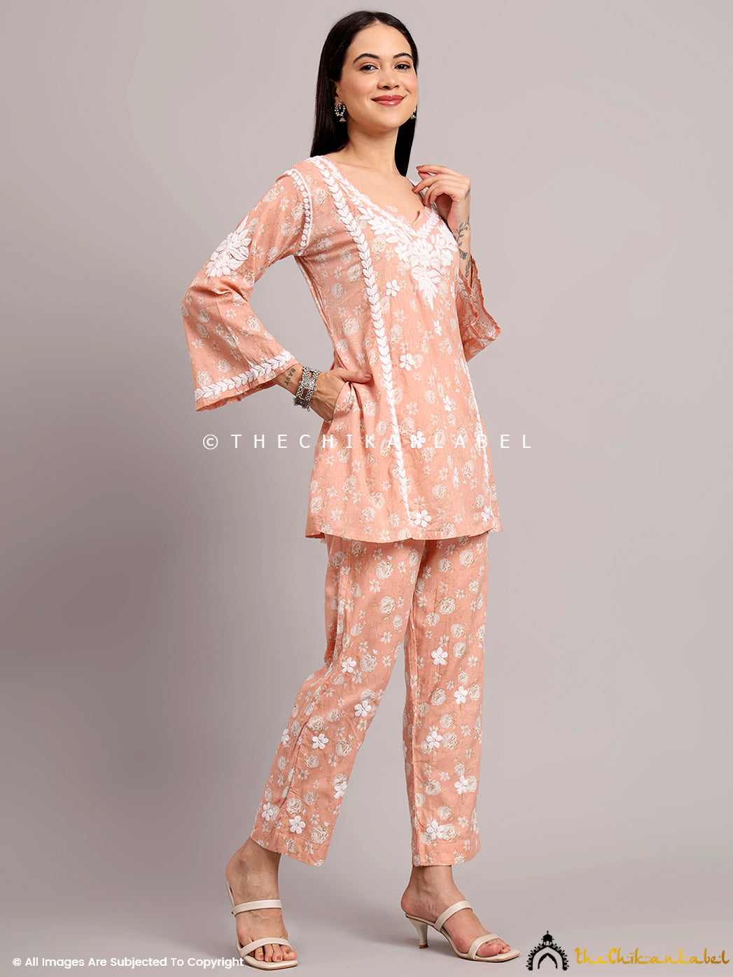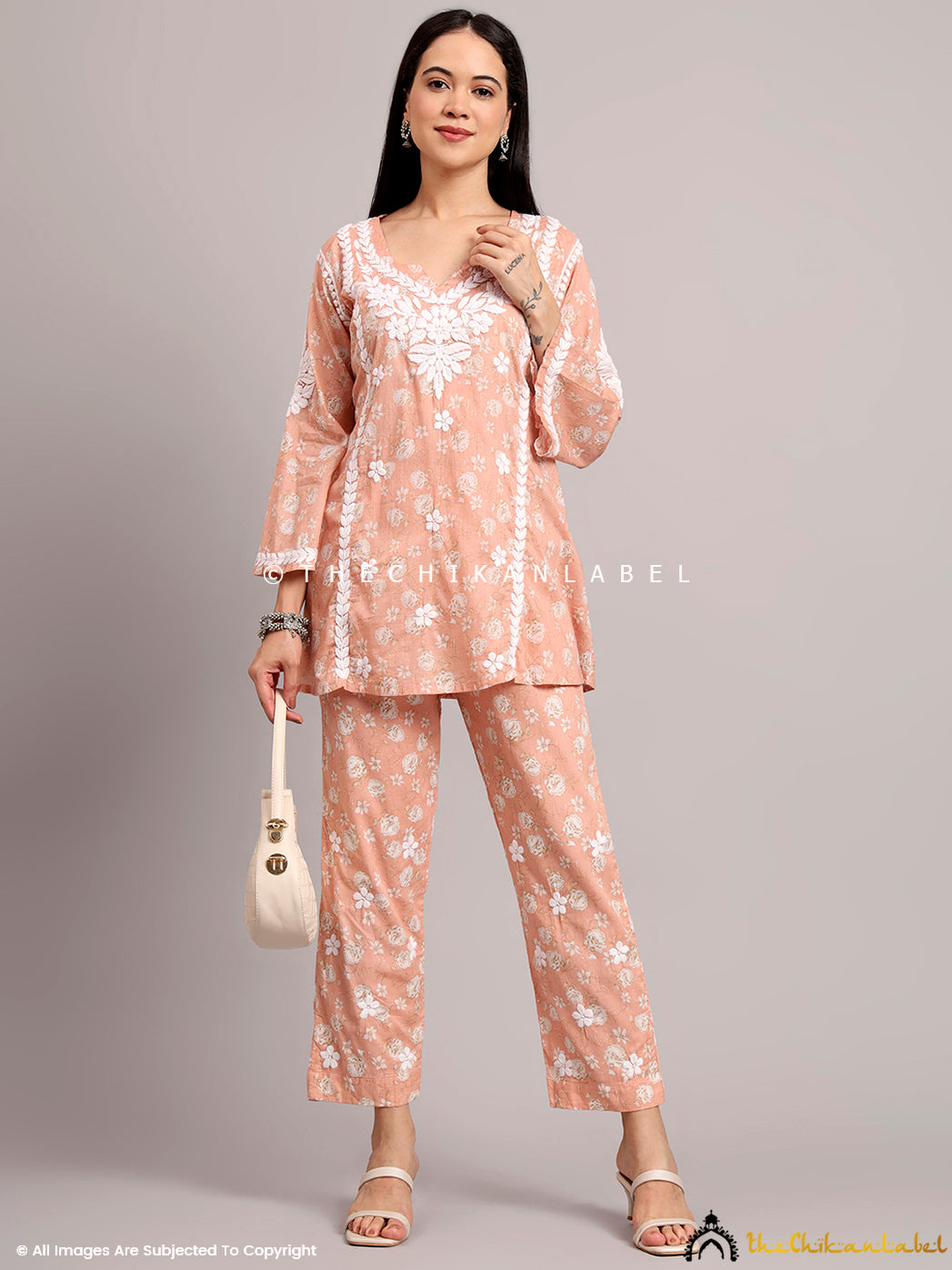 Full-length view of a printed co-ord set with artisanal Chikankari on the kurta front, styled with minimal accessories for a casual ethnic look