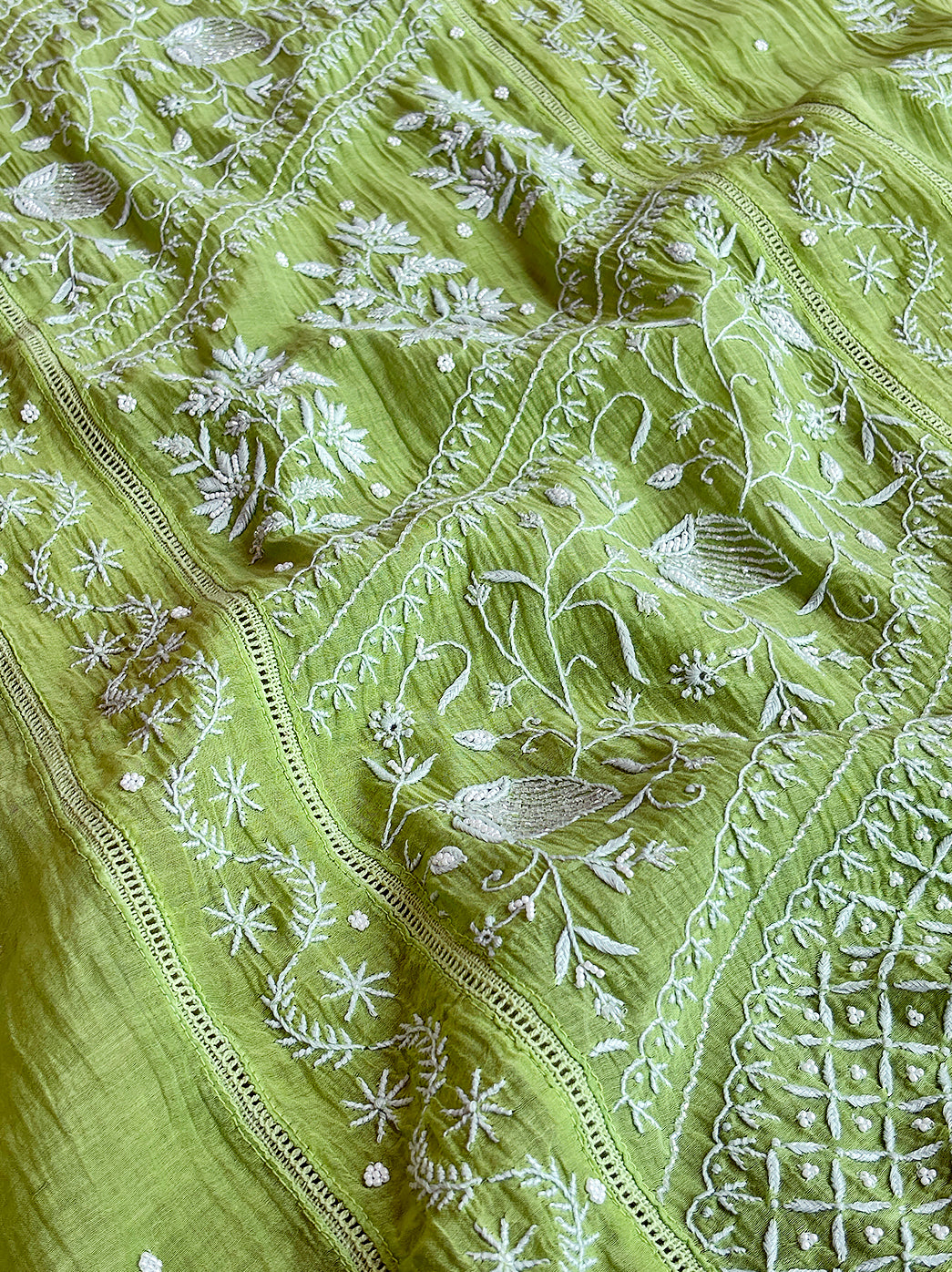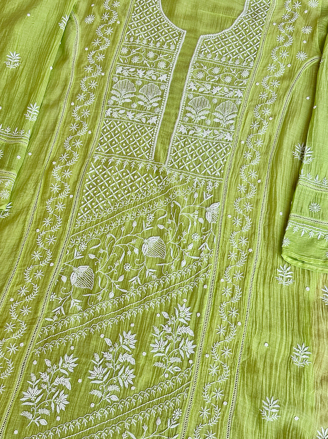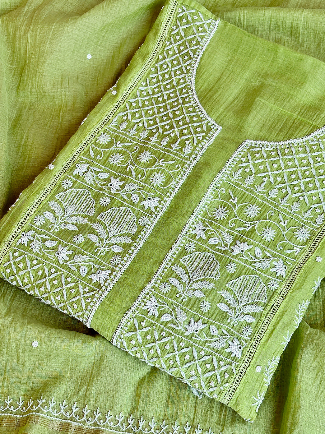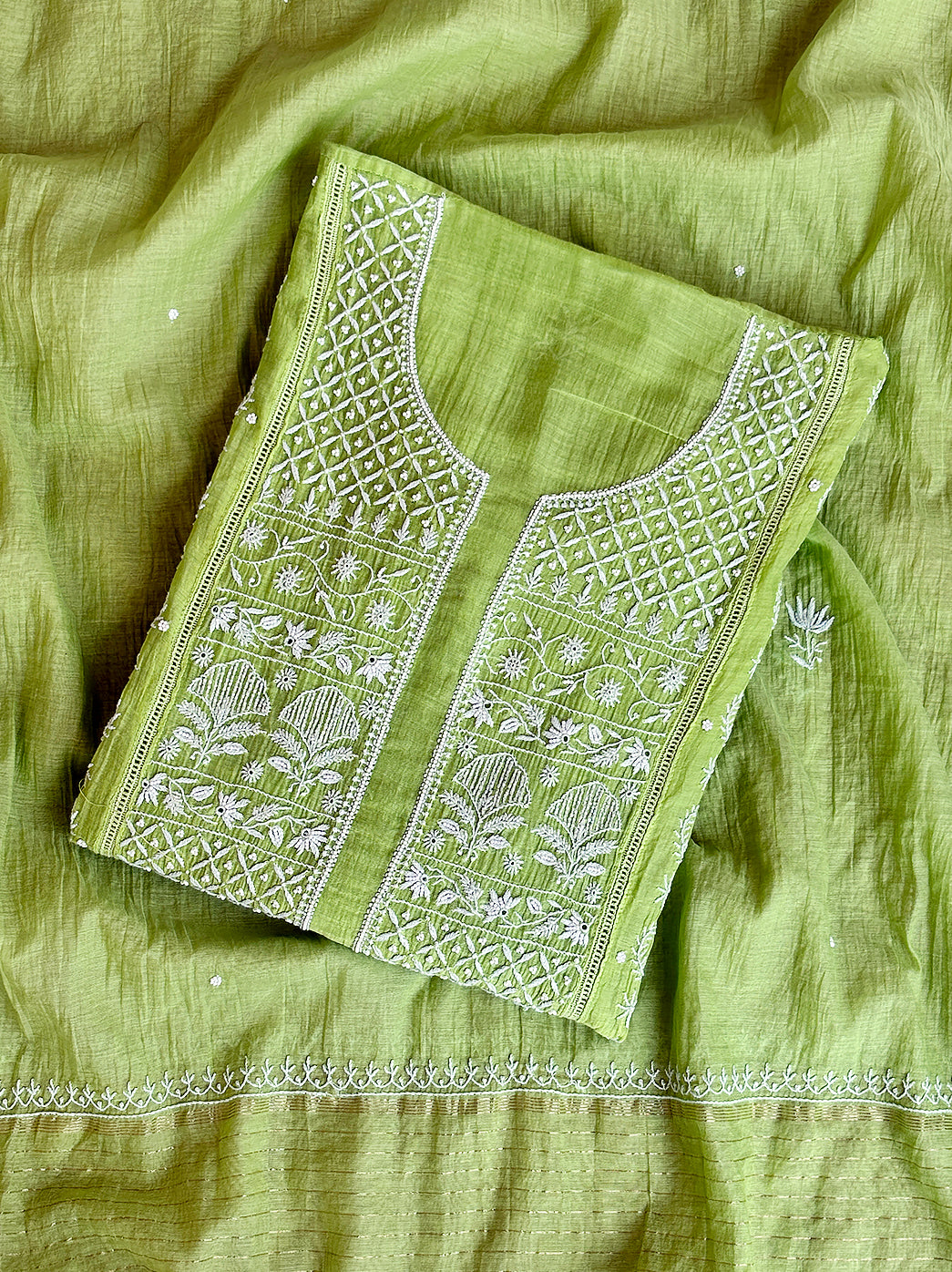 Pista Green Mul Chanderi Un-stitched Chikankari Kurti Piece with Dupatta