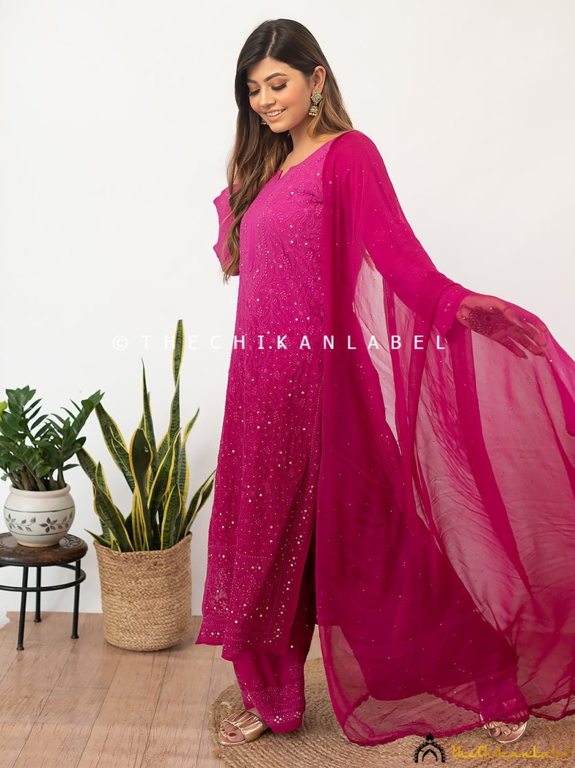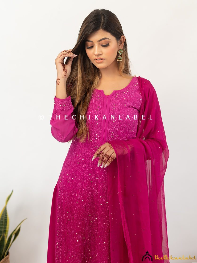 Sitara Chikankari Viscose Kurta Set with Dupatta - Rani Pink