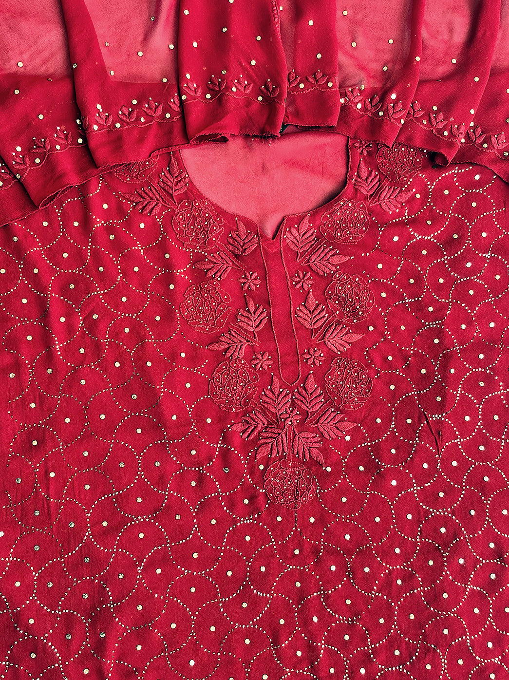 Red Viscose Chikankari Un-Stitched Kurti Piece with Dupatta