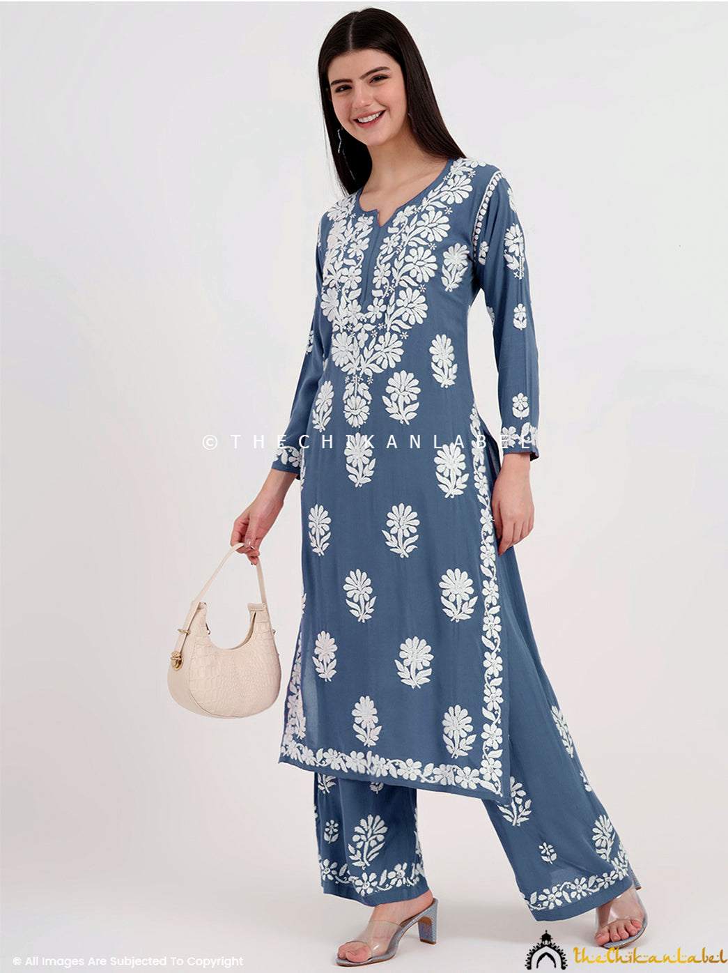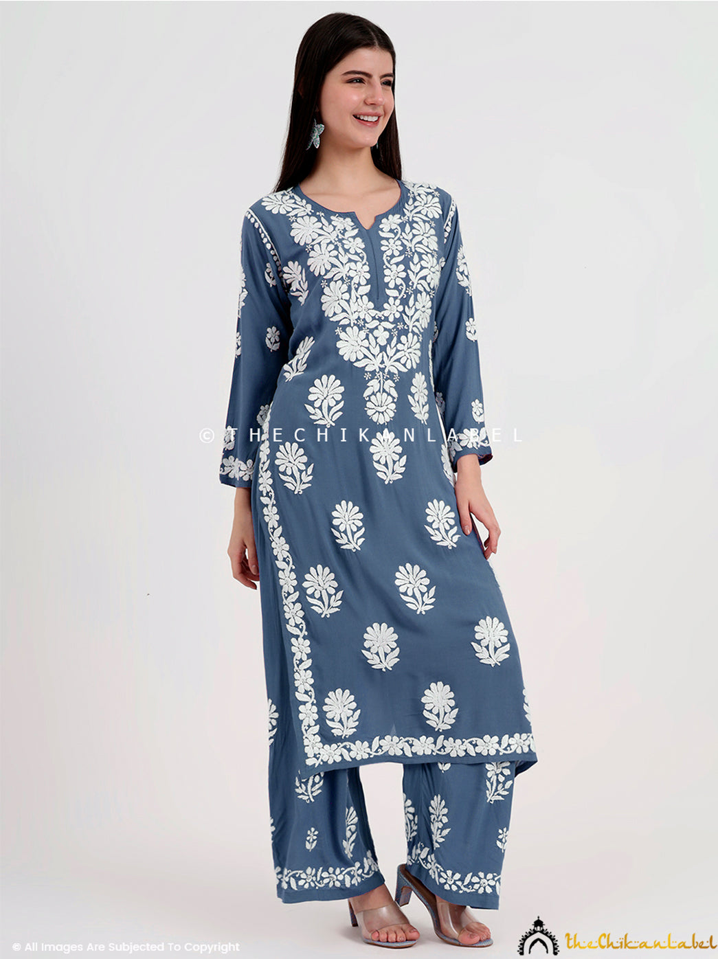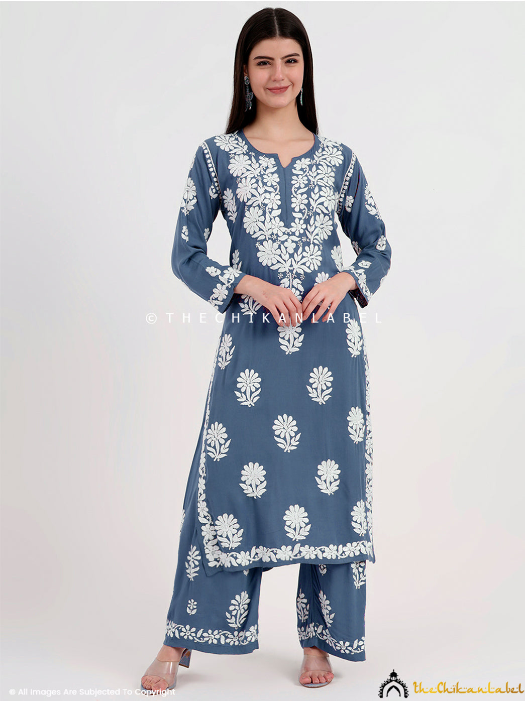 Modal kurti palazzo set showcasing Lucknowi chikankari craftsmanship on soft, breathable modal fabric for a classy ethnic look.