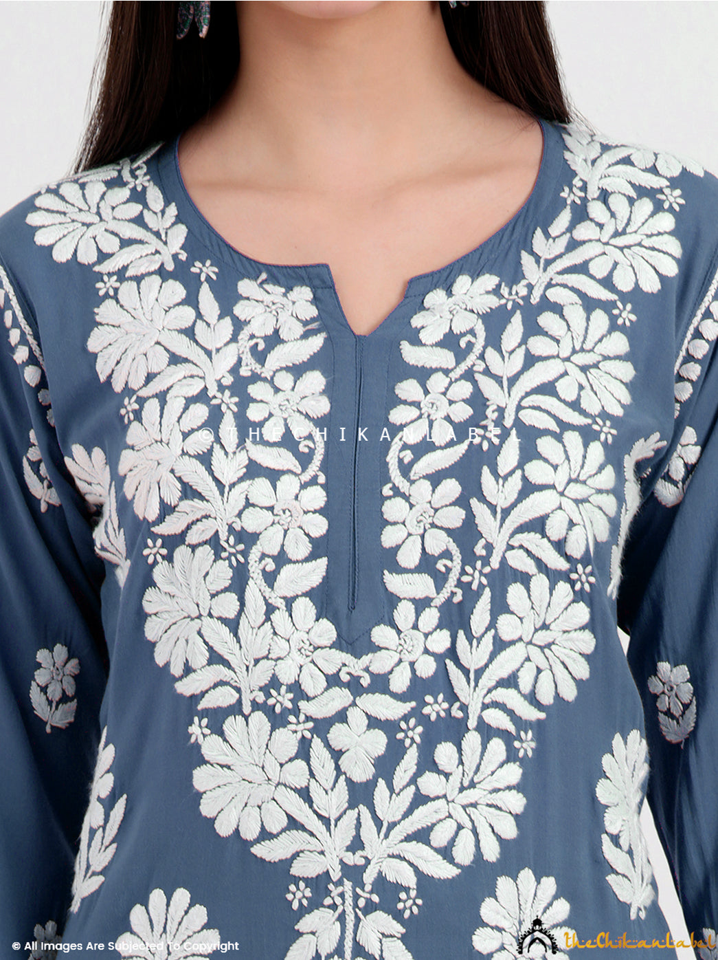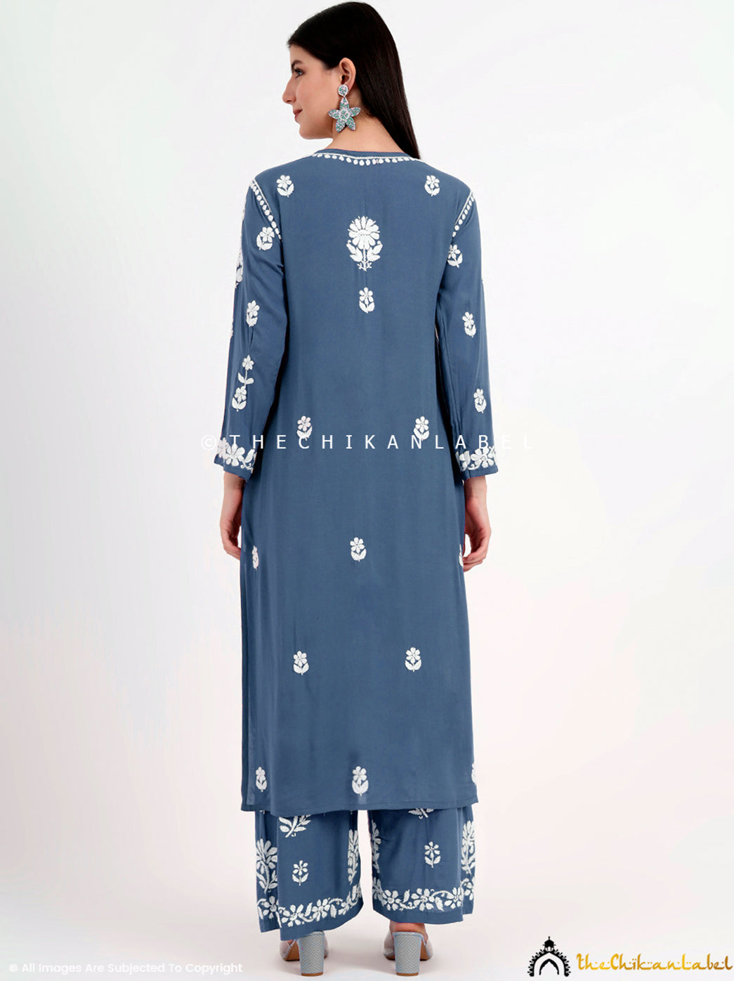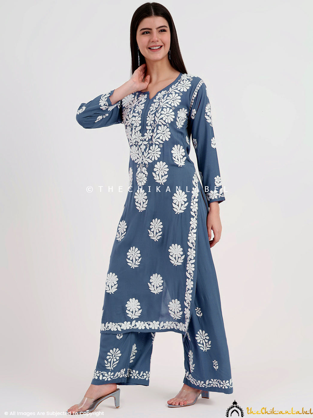 Modal kurti palazzo set showcasing Lucknowi chikankari craftsmanship on soft, breathable modal fabric for a classy ethnic look.
