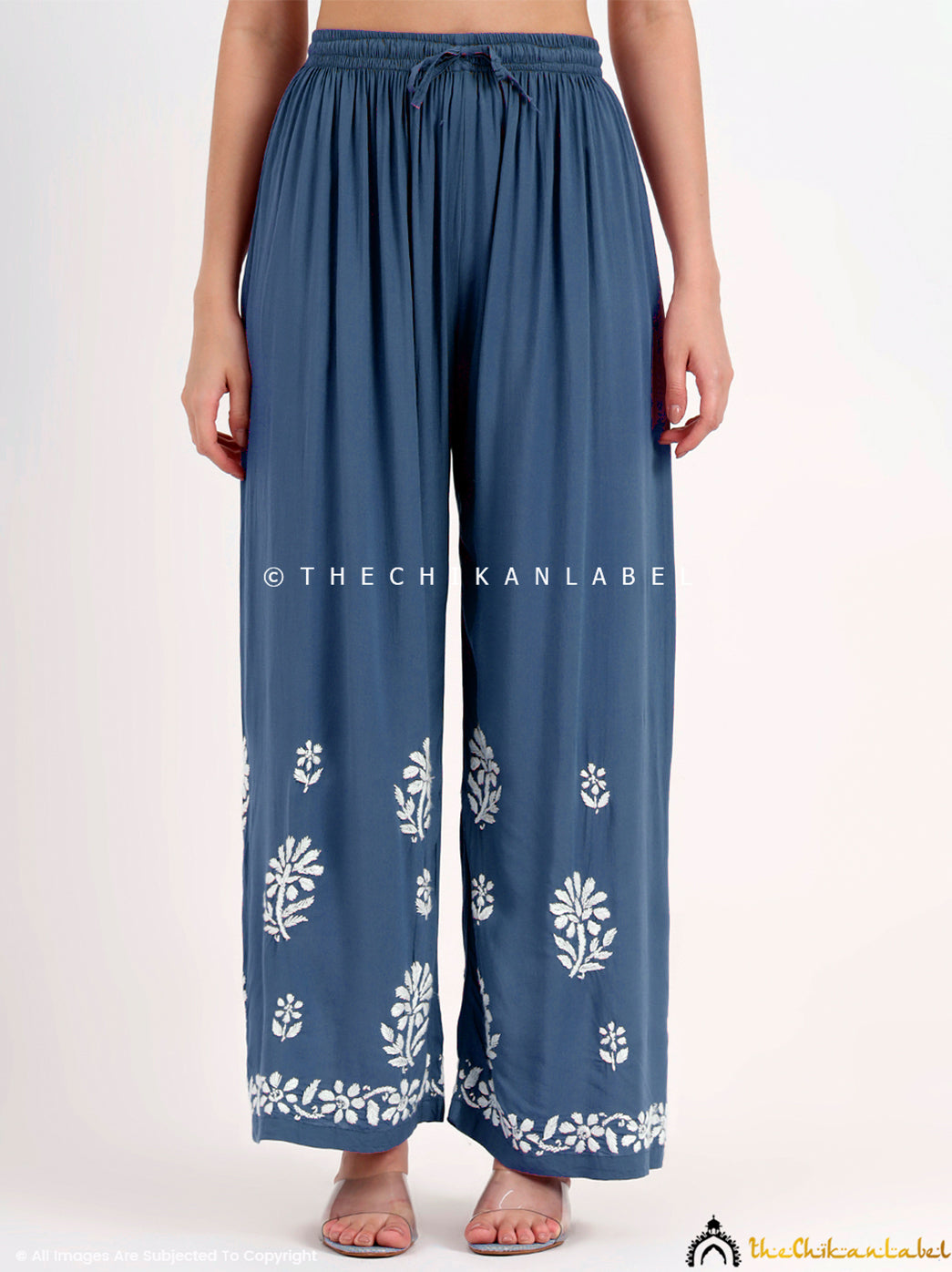 Modal chikankari set with straight kurti and elastic waist palazzo, perfect for office wear or casual ethnic dressing.