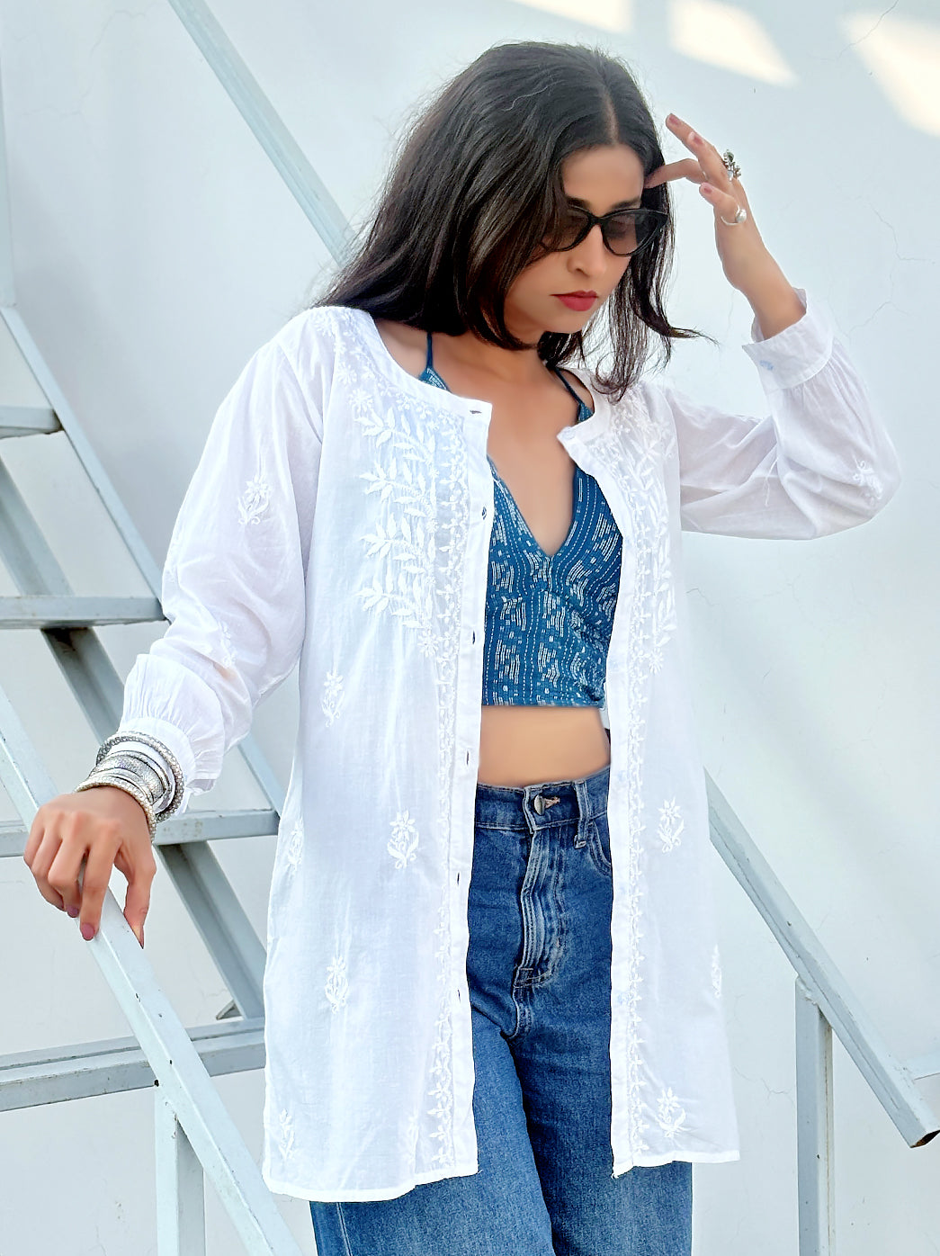 Reva Mulmul Cotton Chikankari Mandarian Collar Shirt - White