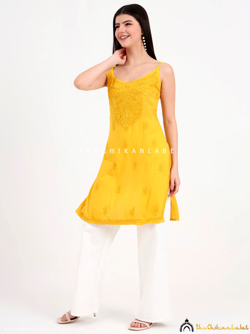 Office-ready chikankari strappy kurti crafted in modal for comfort and timeless appeal.